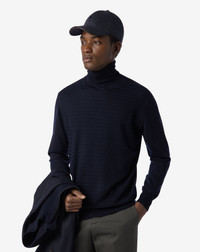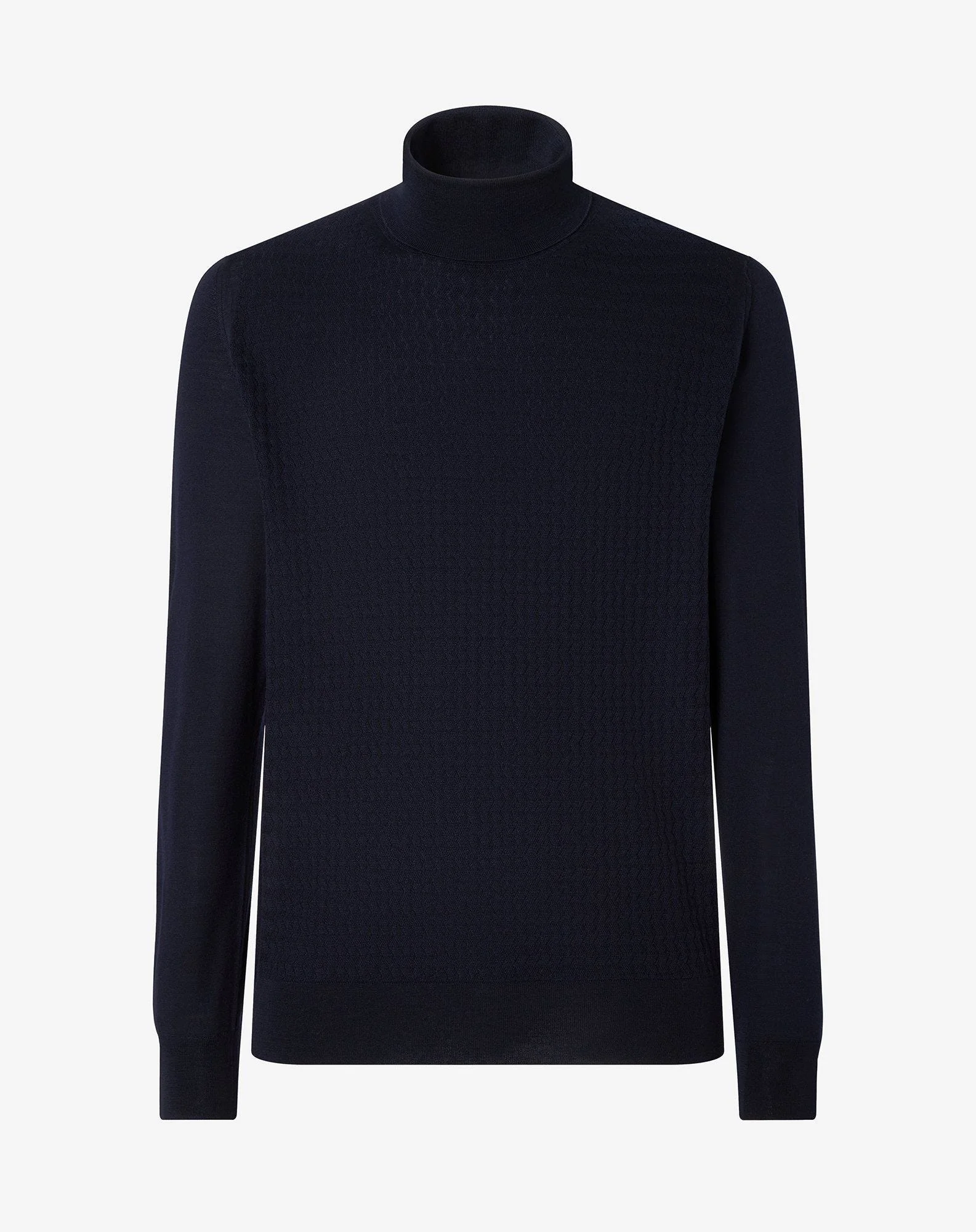 A superb garment that blends sartorial tradition and innovation, this blue long-sleeved mock turtleneck jumper is crafted from extra fine merino wool 18 gauge yarn, guaranteeing unrivalled softness and comfort. Its exclusive wavy knit stitch confers a distinctively elegant texture, enhancing the quality of this OEKO-TEX certified yarn that is both sustainable and safe. Fully made in Italy, this mock turtleneck is the expression of a perfect balance of style and functionality, ideal for the contemporary man who seeks timeless and comfortable elegance. DETAILS AND MATERIALS - 100% virgin wool - long-sleeved turtleneck jumper made from 120's ultra-fine combed merino wool - exclusive wavy knit stitch - 18 gauge - Made in Italy FIT & WASHING - Dry clean with perchloroethylene, do not bleach, do not tumble dry, maximum iron temperature 110°