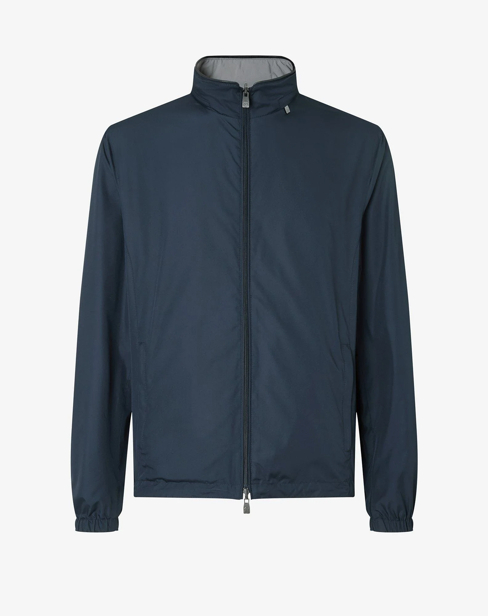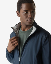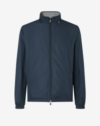 This garment has a regular fit. Dry clean with perchloroethylene, do not bleach, do not tumble dry, maximum iron temperature 110° DETAILS AND MATERIALS - Designed for travel and leisure, this reversible blue ultra light technical fabric jacket offers lightweight protection and freedom of movement. The water-resistant fabric, dual cursor front zip fastening, high collar with leather detail and hood combine with elasticated cuffs, external zipped welt pockets and drawstring hem with adjusters to ensure practicality and comfort. With its 67 cm length, it is a dynamic and functional outerwear, ideal for travelling light and the summer season. FIT & WASHING - 100% polyester - reversible jacket - water resistant - front closure with dual cursor zip - standing collar with leather detail - hood - elasticated cuffs - two outside welt pockets with zip - drawstring and adjusters at the hem - width 67 cm