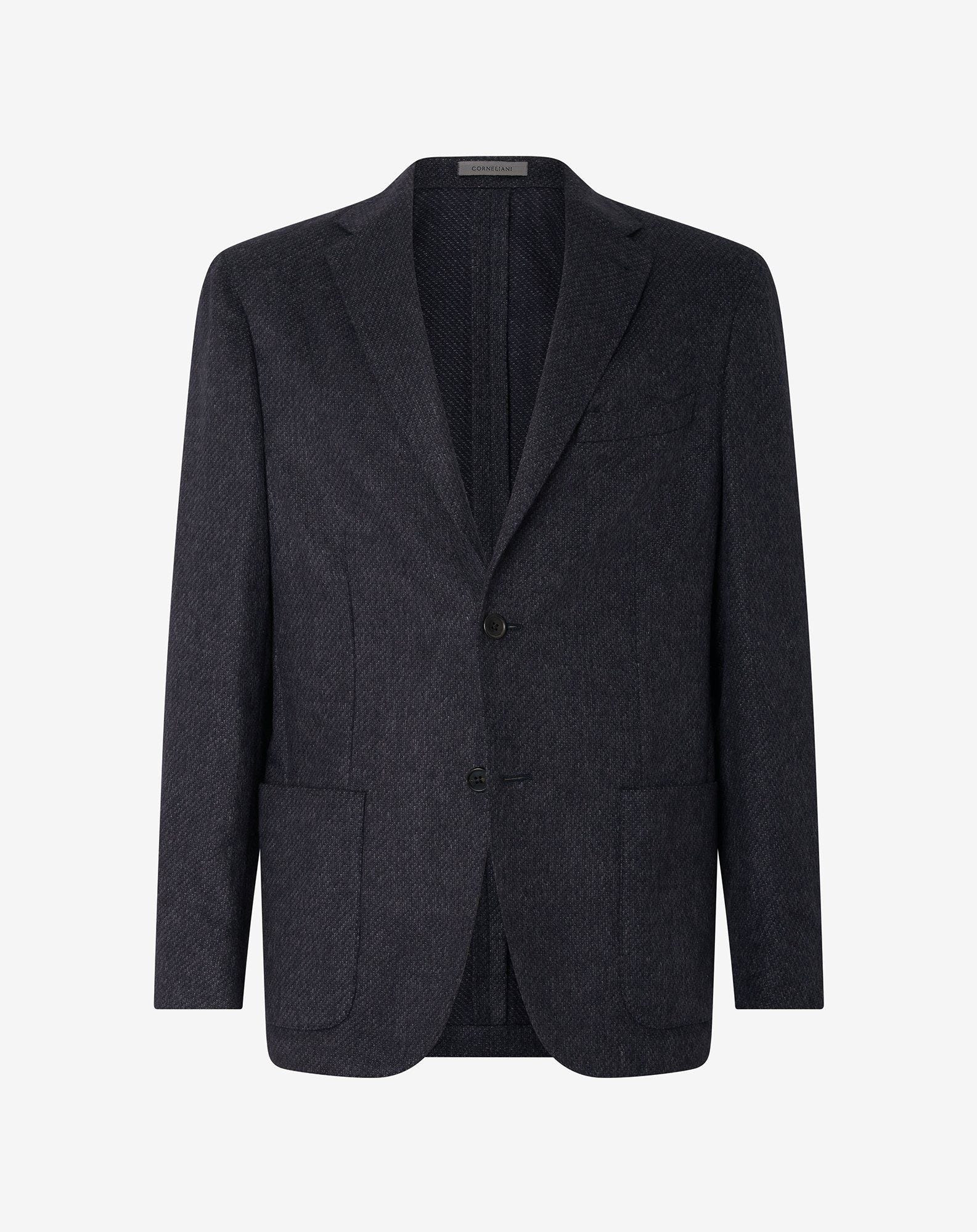 This blue silk and cashmere jacket is the quintessential light and elegant garment. Its fine blend of cashmere and silk enables a super light unlined construction for uncompromising style and comfort. The two-button design is enhanced with AMF stitching at the edge and notch lapels and completed by the breast pocket, appliqued side pockets and double vent on the back, making this jacket the perfect garment for those who seek both functionality and sophistication in their clothing DETAILS AND MATERIALS - 51% silk, 49% cashmere - 2-Button jacket - super light construction - unlined - drop 7 - regular fit - AMF stitching at the edge - notch lapels - breast pocket - appliqued side pockets - double rear vent - length 74 cm FIT & WASHING - Dry clean with perchloroethylene, do not bleach, do not tumble dry, maximum iron temperature 110°