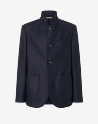 Essential design and modern spirit define this blue single-breasted jacket made from wool and cashmere for a relaxed yet assertive style. Its unlined construction enhances the garment's lightness, while its zip and button front closure highlights its contemporary feel. The standing collar, appliqued pockets and no lapels conjure to create a functional yet sophisticated charm. The breast pocket adds a discreet sartorial touch. Fully Made in Italy. DETAILS AND MATERIALS - 95% virgin wool, 5% cashmere - 4-button jacket - unlined - drop 7 - regular fit - zip and button closure - no lapel - standing collar - appliqued breast pocket - appliqued side pockets - length 75 cm - Made in Italy FIT & WASHING - Dry clean with perchloroethylene, do not bleach, do not tumble dry, maximum iron temperature 110°