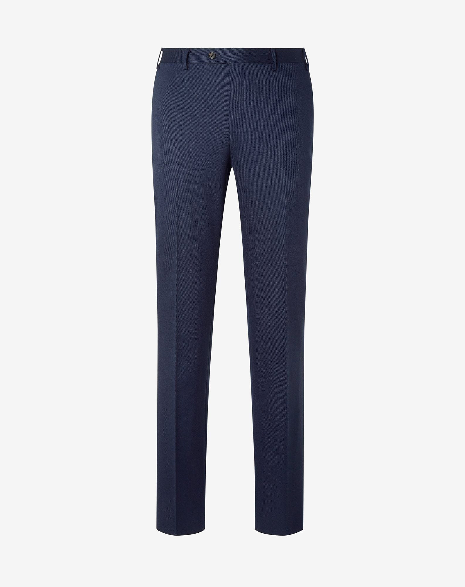 Designed for everyday life with style and practicality, these blue trousers in virgin wool and stretch cotton offer the perfect balance of comfort and refinement. This garment is part of the Washable Project, designed to ensure easy maintenance without sacrificing sartorial quality, making it ideal for the contemporary man. The regular fit with a flat front enhances the clean, modern silhouette, while side slash pockets and double-welt back pockets with buttons add functional detail. A zipped waistband with belt loops ensures a secure and comfortable fit, complemented by a 19 cm leg opening that defines their balanced proportions. Versatile and dynamic, these trousers embody Corneliani’s philosophy of minimalist, contemporary elegance. DETAILS AND MATERIALS - 51% virgin wool, 47% cotton, 2% elastane - flat front Washable trousers - unlined - drop 7 - regular fit - slant side pockets - double-welt and button back pockets - belt loops - zip and waistband - bottom 19 cm - Washable bag included FIT & WASHING - Warm wash up to 30°, do not bleach, dry clean with perchloroethylene, do not tumble dry, maximum iron temperature 150°