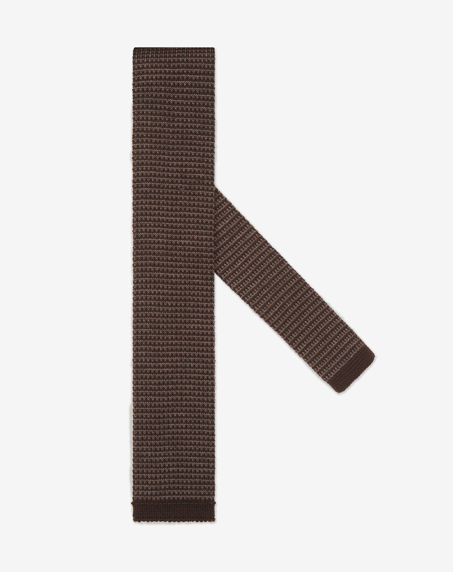 Minimalist and sophisticated, this knit wool tie combines sophisticated texture and everyday versatility. Crafted from 100% wool in shades of brown and beige, it features a thin blade for modern looks inspired by tradition. A distinctive detail, perfect for completing the outfit with a touch of casual elegance. Fully Made in Italy. DETAILS AND MATERIALS - 100% wool - knit tie - blade 5.5 cm - Made in Italy FIT & WASHING - Dry clean with perchloroethylene, do not bleach, do not tumble dry, maximum iron temperature 110°