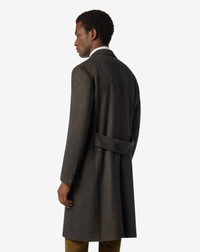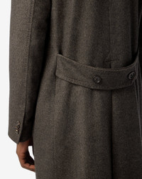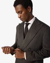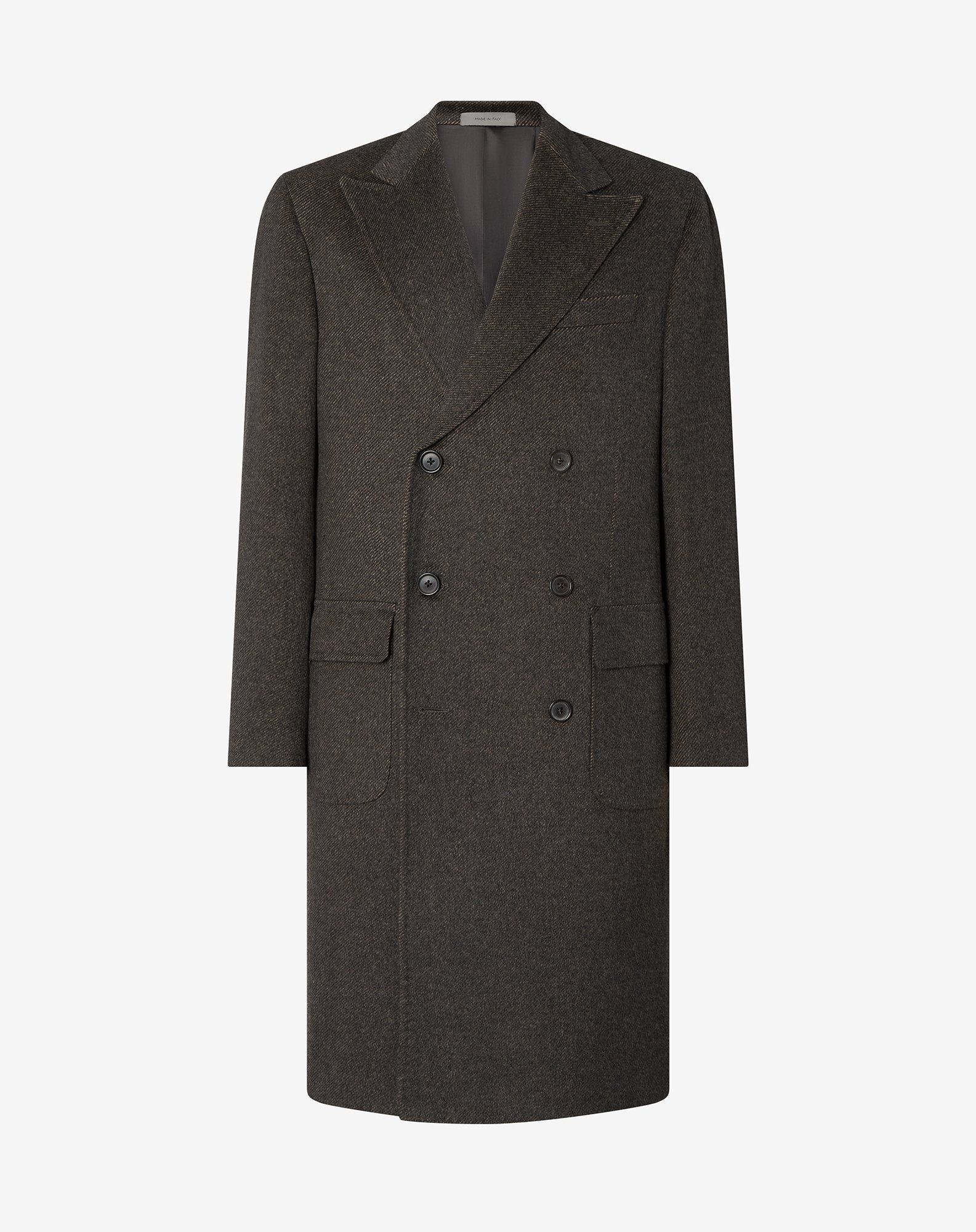 Timeless elegance takes shape in this brown double-breasted coat, crafted from a sophisticated diagonal-pattern virgin wool beaver and cashmere blend. Designed with natural shoulders and a regular fit for balanced comfort, it features pointed lapels, flap pockets, and a rear martingale for a refined silhouette. Every detail—from the AMF edge stitching to the real horn buttons—reflects true Italian craftsmanship. DETAILS AND MATERIALS - 85% virgin wool, 15% cashmere - 6-button double-breasted diagonal pattern wool beaver and cashmere coat - lined - drop 7 - regular fit - pointy lapels - AMF stitching at the edge - appliqued patch side pockets - martingale - central back vent - smooth satin lining - horn buttons - width 105 cm - Made in Italy FIT & WASHING - This garment has a regular fit. The model is wearing a size 50 (IT). Model’s measurements: height 187cm, chest 98cm, waist 82cm, hips 98 cm. Dry clean with perchloroethylene, do not bleach, do not tumble dry, maximum iron temperature 110°