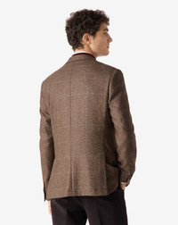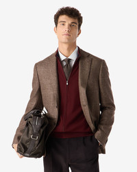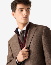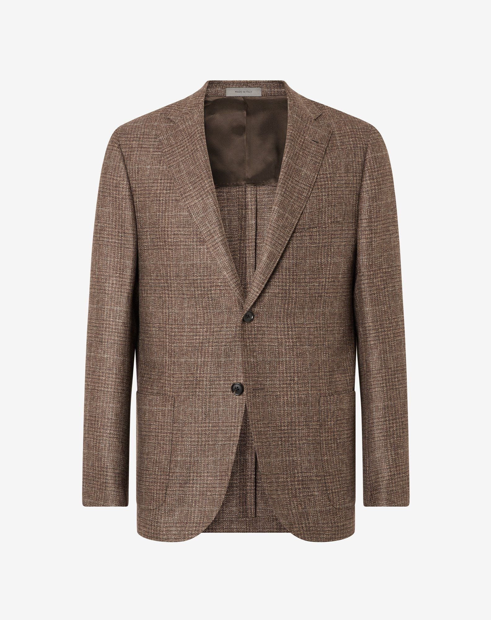 An expression of relaxed elegance and contemporary spirit, this single-breasted, pure virgin wool jacket is defined by a sophisticated glen plaid pattern in brown tones. Part of the Academy Light range, the garment combines sartorial tradition and lightness thanks to its unlined construction and natural shoulder, designed to ensure freedom of movement and comfort. The 9 cm pointed lapels with AMF stitching on the edge and natural horn buttons tell of the attention to detail, while the slim fit enhances the silhouette with ease. The side patch pockets and double vents at the back complete an ideal garment to keep you in style, every day. DETAILS AND MATERIALS - 100% virgin wool - single-breasted two-button glen plaid wool jacket - Academy Light range - unlined - drop 7 - slim fit - natural shoulders - notch lapels - lapel width 9 cm - AMF stitching at the edge - welt breast pocket - patch side pockets - double side vent - natural horn buttons - width 74 cm - Made in Italy FIT & WASHING - This garment has a slim fit. The model is wearing a size 50 (IT). Model’s measurements: height 187cm, chest 98cm, waist 82cm, hips 98cm. Dry clean with perchloroethylene, do not bleach, do not tumble dry, maximum iron temperature 110°