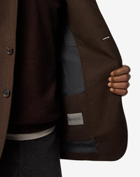This brown jacket blends fine virgin wool fibers with the smooth elegance of silk, achieving a super light, unlined construction for weightless comfort. Enhanced with AMF stitching and notch lapels, the 2-button style features breast pocket, appliqued side pockets and double vent at the back for a versatile touch. DETAILS AND MATERIALS - 80% virgin wool, 20% silk - 2-Button jacket - super light construction - unlined - drop 7 - regular fit - AMF stitching at the edge - notch lapels - breast pocket - appliqued side pockets - double rear vent - length 74 cm FIT & WASHING - This garment has a regular fit. Dry clean with perchloroethylene, do not bleach, do not tumble dry, maximum iron temperature 110°
