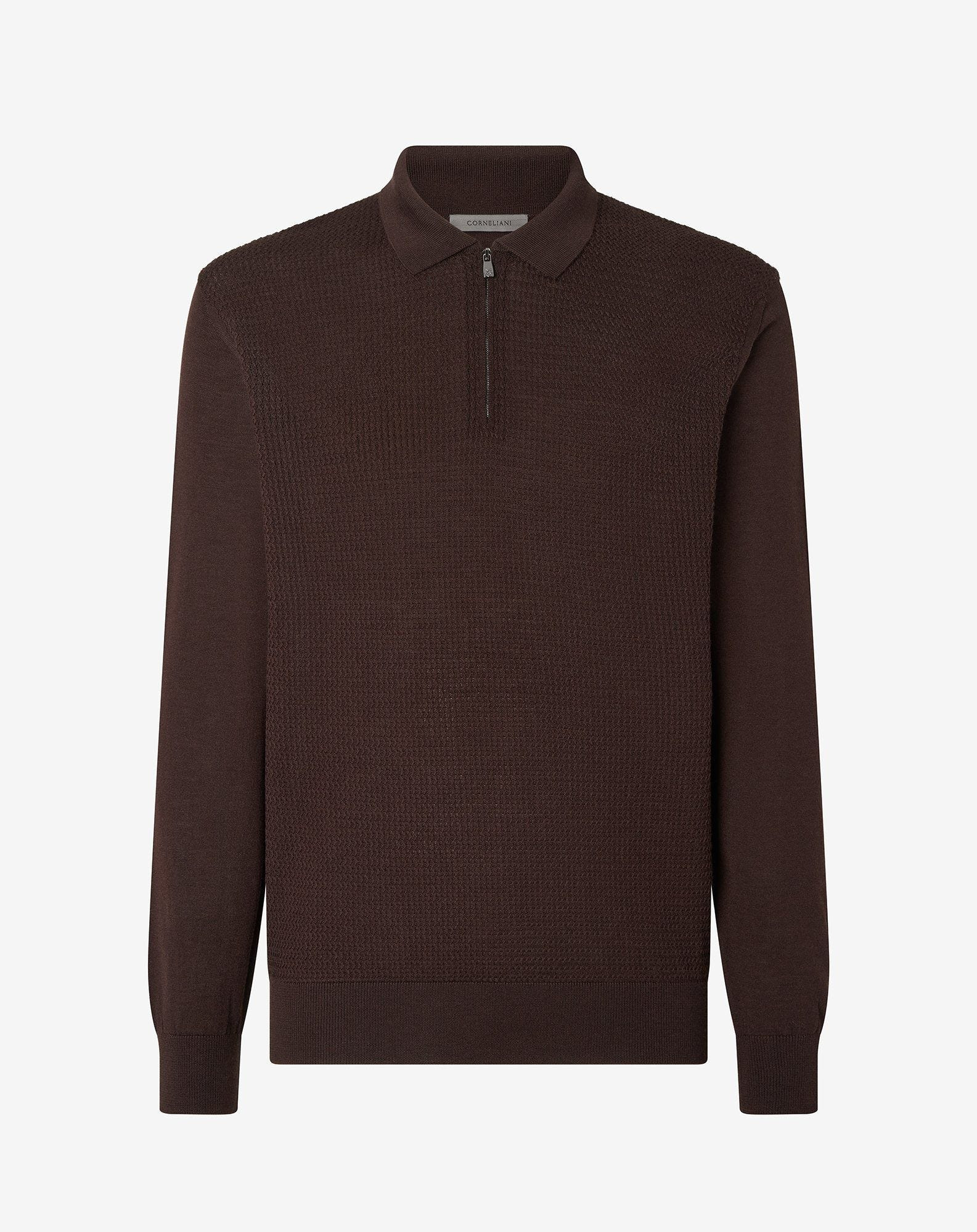 An example of sophisticated elegance and sartorial expertise, this brown long-sleeved polo shirt is crafted from extra fine combed Merino wool and knitted in a 14-gauge structure to ensure lightweight softness. It features an exclusive relief micro stitch, whose refined texture elevates the quality of the OEKO-TEX certified yarn, sustainably produced and safe on the skin. Entirely made in Italy, this polo shirt blends contemporary design with superior comfort, designed for the modern man seeking a versatile and distinguished garment. DETAILS AND MATERIALS - 100% virgin wool - long-sleeved polo shirt with zip made from extra fine combed merino wool - relief micro stitch - 14 gauge - Made in Italy FIT & WASHING - Dry clean with perchloroethylene, do not bleach, do not tumble dry, maximum iron temperature 110°