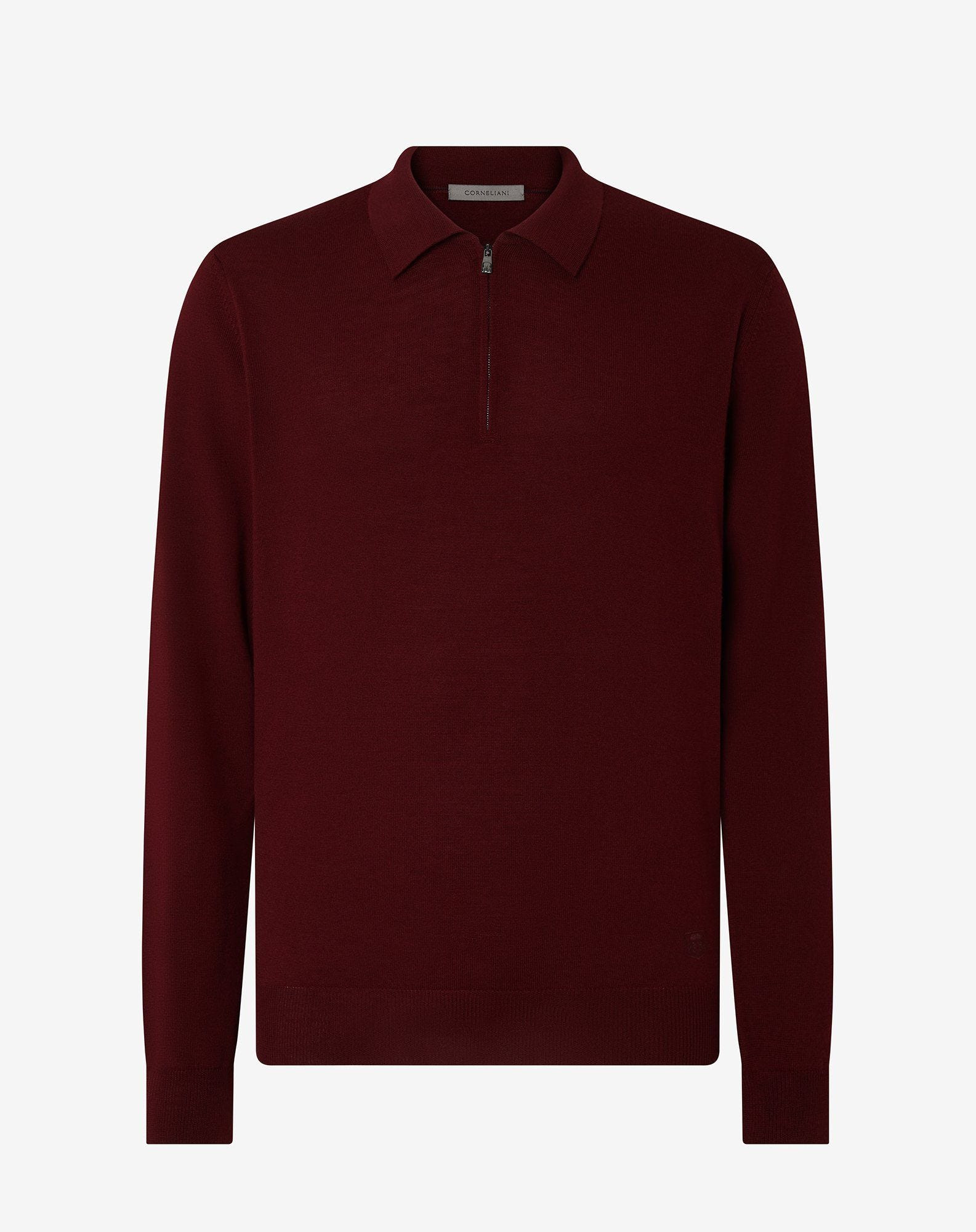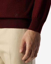 This burgundy zipped long-sleeved polo shirt is made from extra fine pure merino wool in gauge 12 with triple-twisted yarn. Elasticity, strength and natural brilliance are the key features of this innovative fabric that is durable and practical while keeping a tidy look. The yarn is OEKO-TEX-certified, indicating responsible and traceable quality. DETAILS AND MATERIALS - 100% virgin wool - zipped long-sleeved polo shirt made from pure extra fine combed triple twisted wool - 12 gauge - Made in Italy FIT & WASHING - Dry clean with perchloroethylene, do not bleach, do not tumble dry, maximum iron temperature 110°