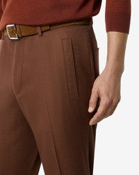 Burned earth pure virgin wool chino trousers, pure contemporary elegance with everyday comfort. The regular fit and drop 7 ensure balanced lines, while the flat front enhances their minimalist design. The perfect fit is achieved through an extension with hook button at the waist and a waistband with zip for optimal comfort. The classic leg bottom (19 cm) confirms the versatile and sophisticated fit. Unlined, lightweight and breathable: the ideal garment for those looking for sartorial quality and timeless style. DETAILS AND MATERIALS - 100% virgin wool - flat front chino trousers - unlined - drop 7 - regular fit - extendible belt with hook button - zip and waistband closure - belt loops - hemmed vertical side pockets - welt back pockets - bottom width 19 cm FIT & WASHING - This garment has a regular fit. Dry clean with perchloroethylene, do not bleach, do not tumble dry, maximum iron temperature 110°
