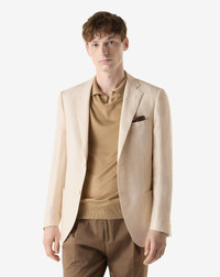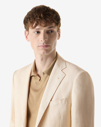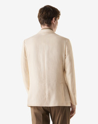 A cream-coloured linen and lyocell jacket designed for the warm season, light and sophisticated in its unlined two-button construction. The blend of linen and lyocell offers a cool feel with a natural drop, while drop 7 and regular fit maintain a balanced line. The 9 cm truncated peak lapels with AMF edge stitching, the welt breast pocket and the patch pockets define a minimalist elegance, completed by the double back slit and the 74 cm length. The iridescent diagonal lining and real horn buttons add a sophisticated accent. A garment Made in Italy for contemporary summer separates. DETAILS AND MATERIALS - 63% linen, 37% lyocell - unlined single-breasted two-button jacket - drop 7 - regular fit - AMF stitching at the edge - notch lapels - lapel width 9 cm - welt outbreast pocket - appliqued front pockets - double rear vent - slanted iridescent lining - horn buttons - back length 74 cm - Made in Italy FIT & WASHING - This garment has a regular fit. Dry clean with perchloroethylene, do not bleach, do not tumble dry, maximum iron temperature 110°