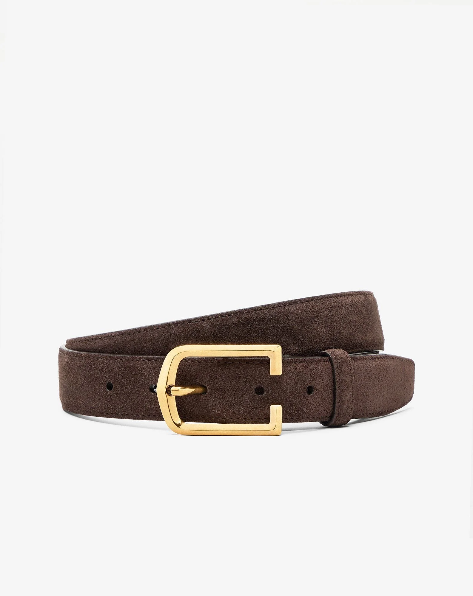 Defining this dark brown suede belt is the stitched rounded construction, which gives presence and clean lines without excess. The 30 mm height makes it easy to fit into everyday outfits, while the exclusive logo buckle adds a discreet signature. Inside, the soft grey nappa leather lining completes an accessory Made in Italy with attention to detail. DETAILS AND MATERIALS - 100% leather - rounded sewn suede belt - height 30 mm - exclusive logo buckle - soft grey nappa leather lining - Made in Italy
