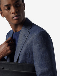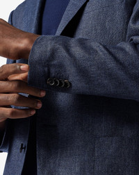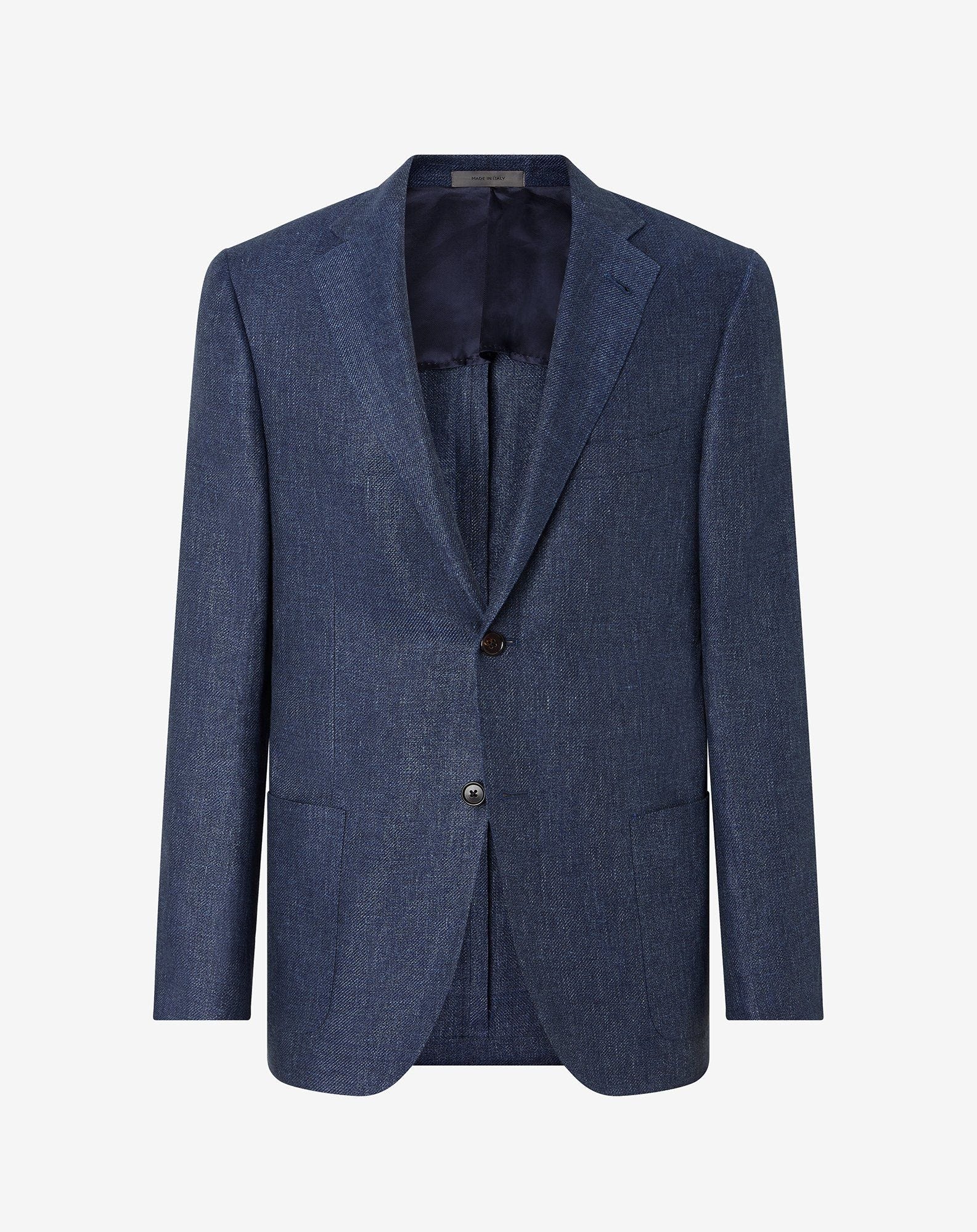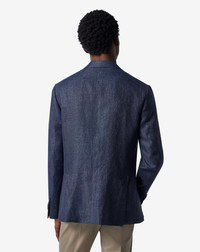 Quality and style in this unlined single-breasted two-button jacket made from denim blue linen and lyocell. A symbol of menswear, designed for the man who seeks an impeccable style with well crafted details, such as the notch lapels and horn buttons. DETAILS & MATERIALS - 63% linnen, 37% lyocell - ongevoerd tweeknoops single-breasted colbert - regular fit - AMF-steek op de zoom - notch revers - breedte revers 9 cm - paspelborstzak - opgestikte zijzakken - dubbele achtersplit - diagonale iriserende voering - knopen van echt hoorn - lengte aan de achterkant 74 cm - Made in Italy FIT & WASHING - This garment has a regular fit. The model is wearing a size 50 (IT). Model measurements: height 187cm, chest 98cm, waist 82cm, hips 98cm. Dry clean with perchloroethylene, do not bleach, maximum iron temperature 110°, do not tumble dry