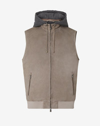 The greige 100% leather suede is a sophisticated and functional garment designed for optimal comfort in transitional months. Padded with man-made down, it offers warmth with a minimalist and contemporary style. The detachable hood and metal dual-cursor zip closure provide versatility, while the two zipped welt pockets and the ribbed knit trim at the hem complete the design with practical details: this gilet is made in Italy to provide a sophisticated yet functional look. DETAILS AND MATERIALS - 100% leather - synthetic down padded gilet - detachable hood - drop 7 - metal dual cursor zip closure - two welt back pockets with zip - ribbed knit trim on hem - flannel lining - length 66 cm - Made in Italy FIT & WASHING - Dry clean with perchloroethylene, do not bleach, do not tumble dry, maximum iron temperature 110°