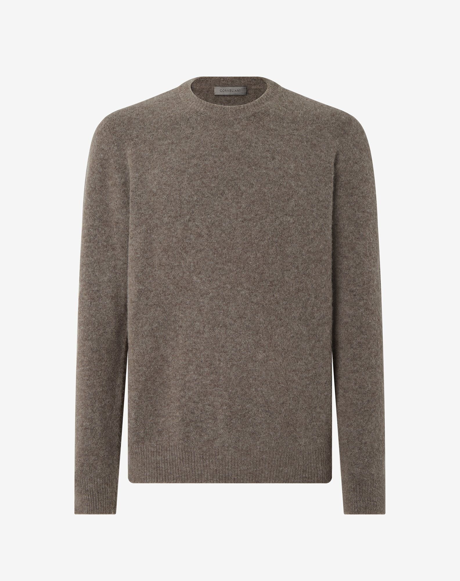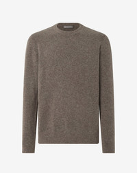 Made from superfine 140’s merino wool and cashmere, this taupe long-sleeved crew neck jumper features an impalpable yarn that hugs with a voluminous yet incredibly soft and lightweight embrace. Minimalist in shape, this jumper is rich in detail and performance. Fully Made in Italy. DETAILS AND MATERIALS - 59% virgin wool, 28% polyamide, 10% cashmere, 3% elastane - 140's ultra-fine combed wool long-sleeved crew neck jumper - 7 gauge - Made in Italy FIT & WASHING - The model is wearing a size 50 (IT). Model’s measurements: height 187cm, chest 98cm, waist 82cm, hips 98cm. Dry clean with perchloroethylene, do not bleach, do not tumble dry, maximum iron temperature 110°