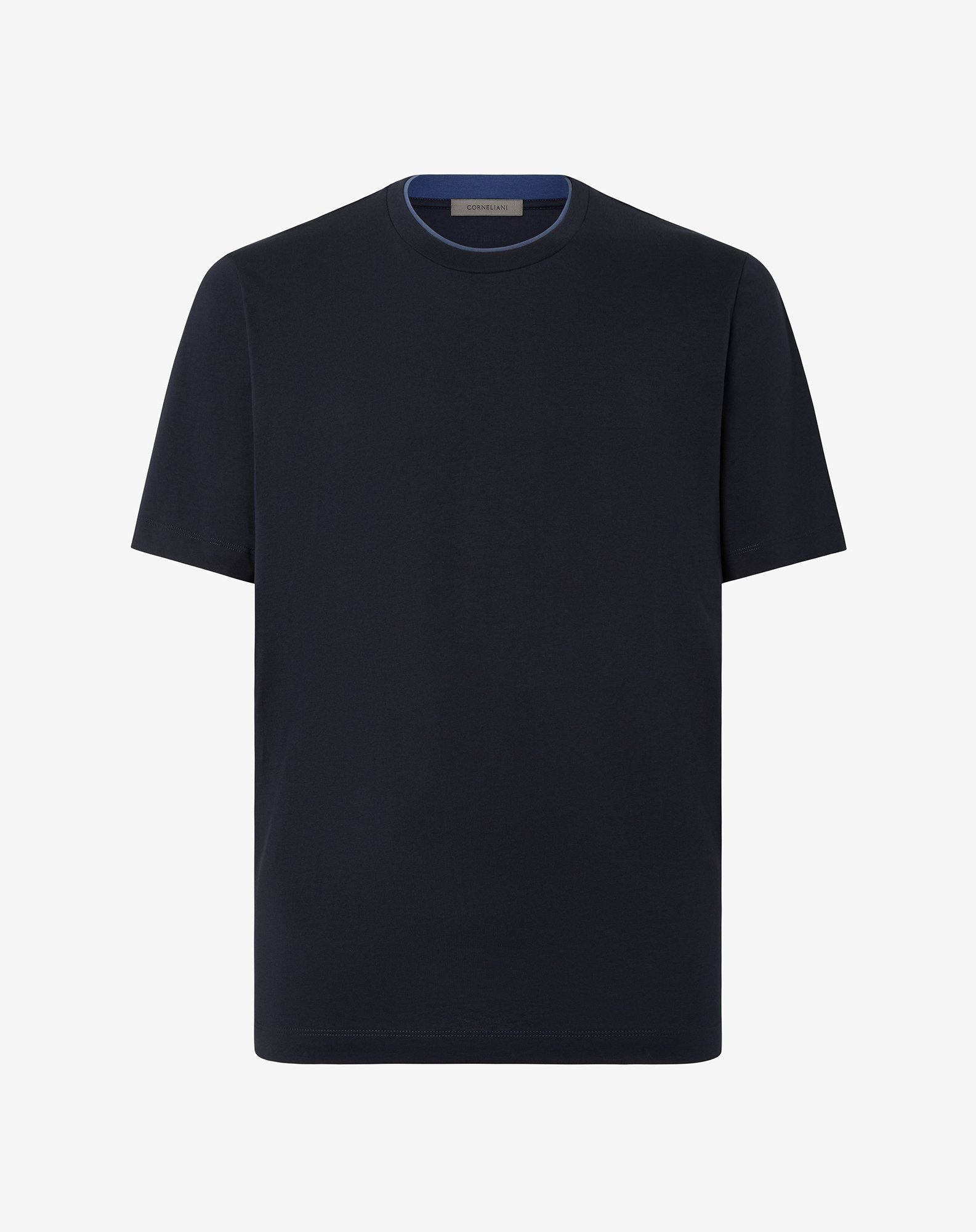 This navy blue short-sleeved crew neck t-shirt is made from pure compact cotton jersey, a fabric whose durable, compact structure ensures an impeccable fit. The two-tone double collar adds an understated graphic detail, perfect for an essential yet refined style. DETAILS AND MATERIALS - 100% cotton - short sleeve crew neck t-shirt made from pure compact cotton jersey - two-tone double collar FIT & WASHING - Dry clean with perchloroethylene, do not bleach, do not tumble dry, maximum iron temperature 110°