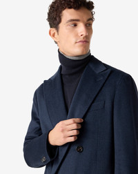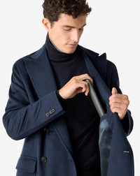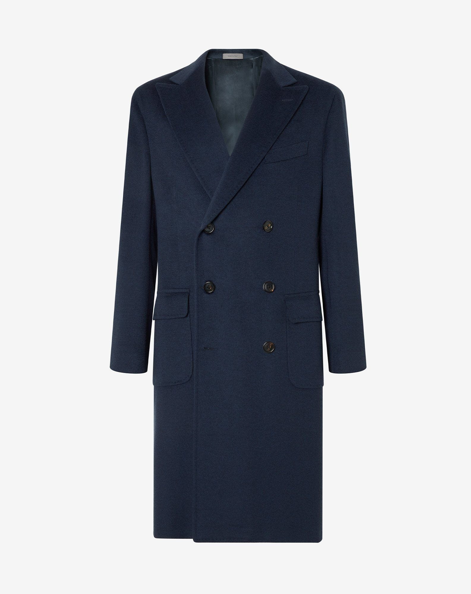 Timeless elegance takes shape in this light blue double-breasted coat made from pure wool beaver. Its natural shoulder design and regular fit offer balanced comfort, while pointy lapels, flap pockets and rear martingale achieve a sophisticated effect. Each detail, from AMF edge stitching to real horn buttons, shows Italian know-how. Essential, contemporary. Fully Made in Italy. DETAILS AND MATERIALS - 100% virgin wool - 6-button double-breasted pure wool beaver coat - lined - regular fit - drop 7 - pointy lapels - 7mm AMF stitching at the edge - appliqued patch side pockets - martingale - central back vent - smooth satin lining - horn buttons - width 105 cm - Made in Italy FIT & WASHING - This garment has a regular fit. The model is wearing a size 50 (IT). Model’s measurements: height 187cm, chest 98cm, waist 82cm, hips 98cm. Dry clean with perchloroethylene, do not bleach, do not tumble dry, maximum iron temperature 110°