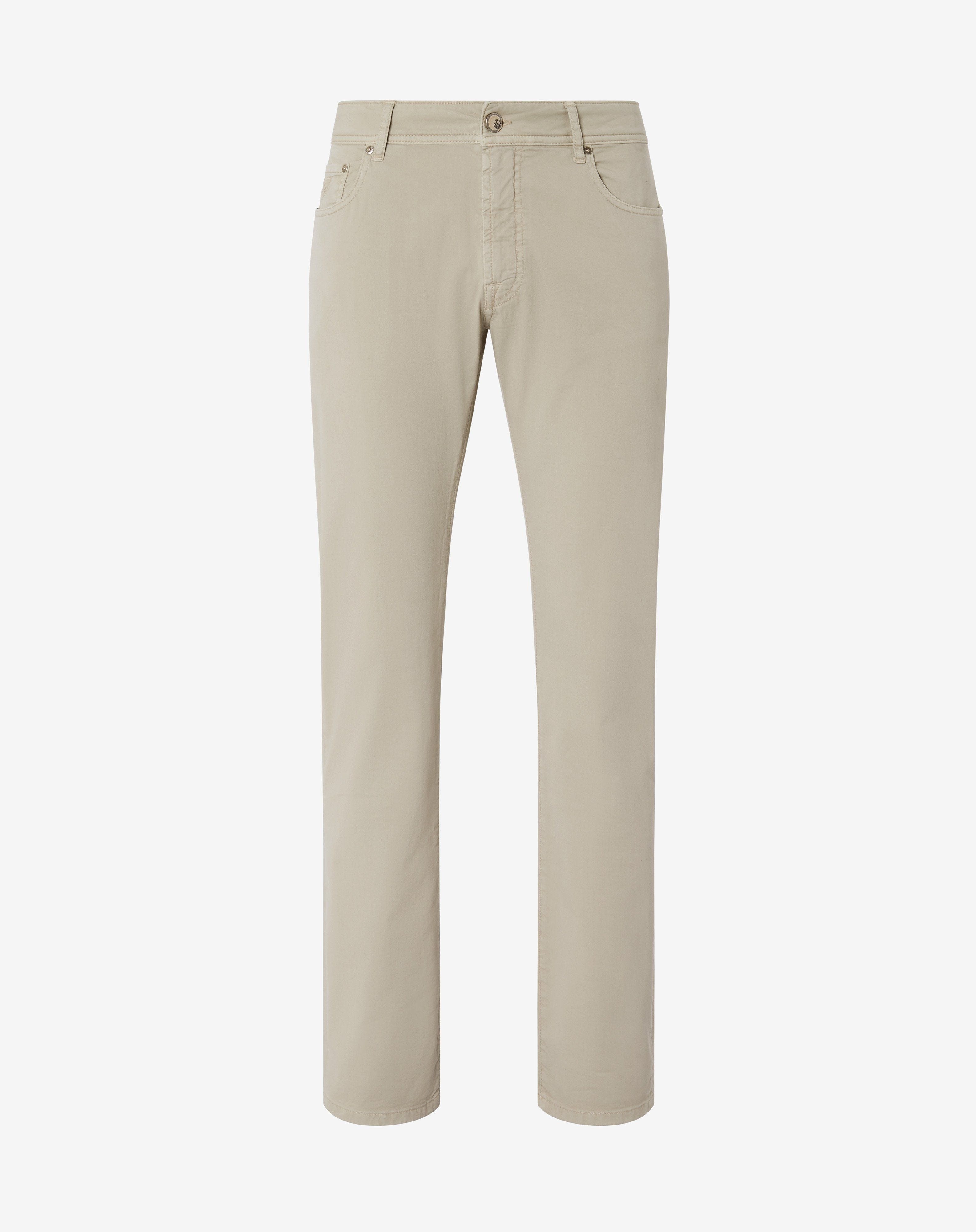 The Men's five-pocket stretch cotton and silk trousers have a classic fit and carefully designed details that personalize the garment, such as the Corneliani crest on the watch pocket and back label, and the logo buttons and rivets. Designed as a versatile garment, the 5-pocket trousers naturally adapt to formal or casual outfits. The garment-dyeing process guarantees unique colour shades and makes the trousers soft. DETAILS & MATERIALS - 95% cotton, 4% silk, 1% elastane - garment-dyed stretch gabardine 5-pocket trousers - drop 7 - classic fit - Corneliani crest on coin pocket and back tag - logo buttons and rivets - bottom width 18 cm FIT & WASHING - The model is wearing a size 50 (IT). Model measurements: height 187cm, chest 98cm, waist 82cm, hips 98cm. Dry clean with perchloroethylene, do not bleach, iron at 110° maximum, do not use dryer