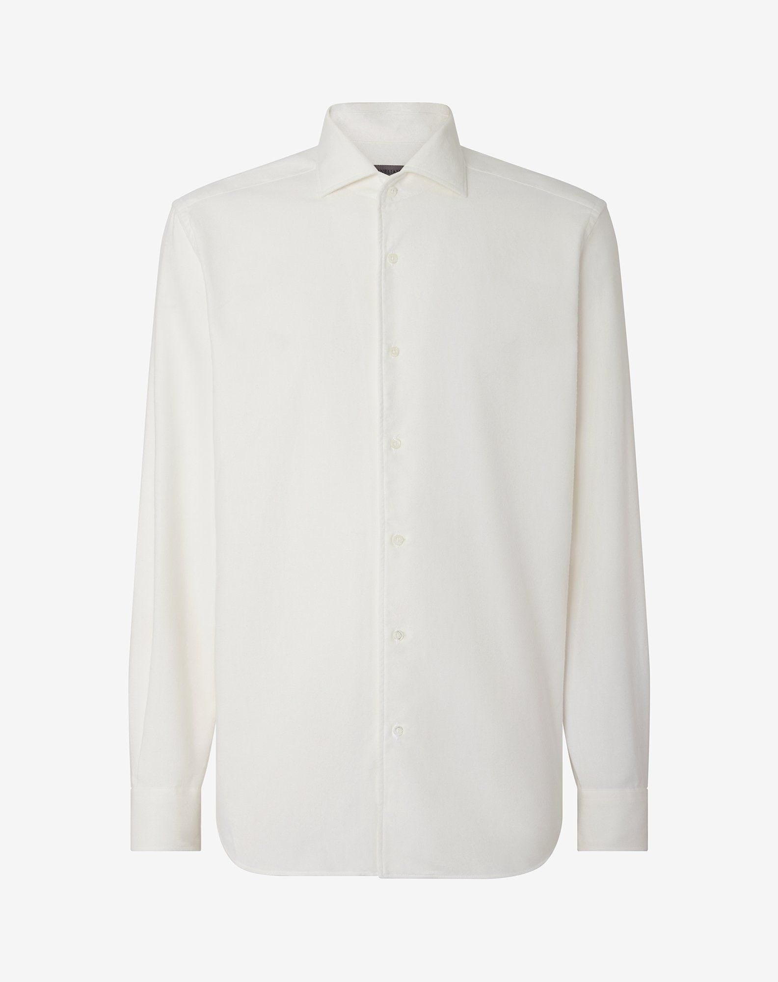 As soft as a hug, this white cotton and cashmere flannel shirt interprets winter elegance with a casual and sophisticated spirit. Cashmere gives the fabric a surprisingly soft and warm feel, maintaining the lightness and natural breathability of cotton. The dual-use collar adds versatility to the garment, perfect for wearing with or without a tie. Its regular fit ensures comfort and ease of movement, making it a valuable ally on the coldest days, under a blazer or on its own. A modern essential, created for the man who seeks a balance between sartorial tradition and everyday comfort. DETAILS AND MATERIALS - 95% cotton, 5% cashmere - long-sleeved cotton flannel and cashmere shirt - regular fit - dual use collar FIT & WASHING - This garment has a regular fit. The model is wearing a size 41 (IT). Model’s measurements: height 187cm, chest 98cm, waist 82cm, hips 98cm. Maximum wash temperature 40°, do not bleach, dry clean with perchloroethylene, do not tumble dry, maximum iron temperature 110°