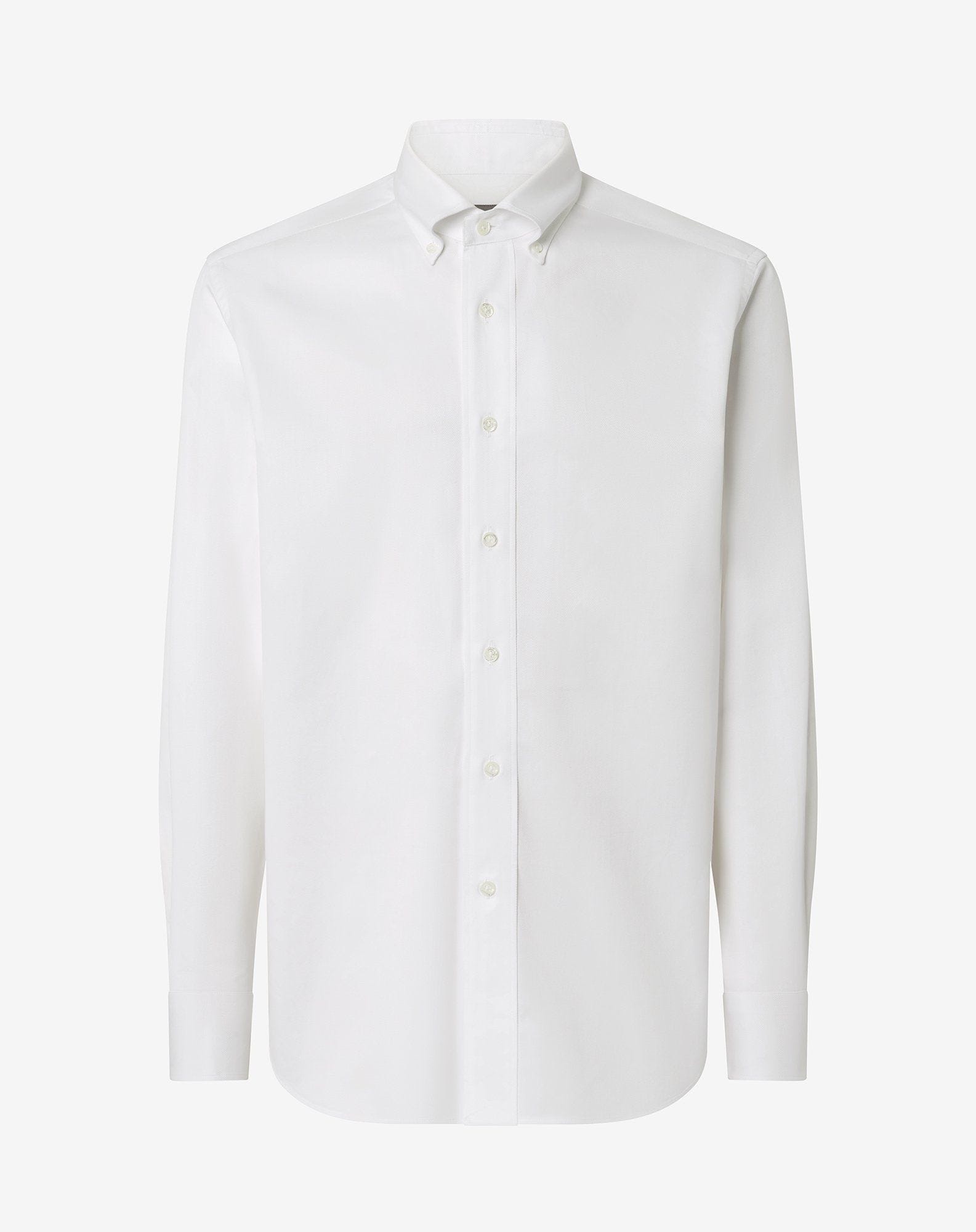 The white dobby cotton shirt with micro honeycomb is a garment that blends comfort and elegance on any occasion. Versatile and suitable for both casual and formal occasions, the shirta€™s rounded cuffs perfectly match the button down collar. DETAILS & MATERIALS - 100% cotton - long-sleeved 100/2 dobby cotton shirt - regular fit - button down collar - rounded cuffs - gusset with Corneliani crest FIT & WASHING - This garment has a classic fit. The model is wearing a size 41 (IT). Model measurements: height 187cm, chest 98cm, waist 82cm, hips 98cm. Warm wash up to 40°, do not bleach, maximum iron temperature 150°, dry clean with perchloroethylene, do not tumble dry