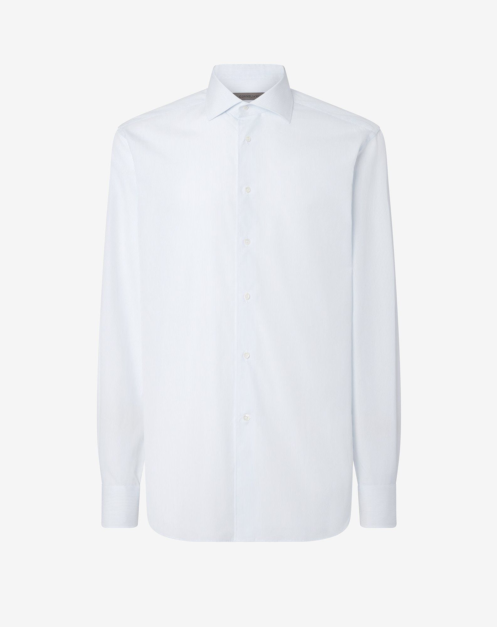 Designed for everyday elegance without sacrificing comfort, this long-sleeved shirt is made from pure cotton with a delicate light blue micro stripe pattern. The soft feel and impeccable construction make it an essential piece of contemporary wardrobe. The Italian collar and rounded cuffs add a formal yet versatile touch, an ideal match for more casual tailoring or suits. The regular fit guarantees proportion and freedom of movement, a garment of casual elegance with lots of attention to detail. DETAILS AND MATERIALS - 100% cotton - long sleeve cotton shirt - regular fit - straight point collar - rounded cuffs FIT & WASHING - This garment has a regular fit. The model is wearing a size 41 (IT). Model’s measurements: height 187cm, chest 98cm, waist 82cm, hips 98cm. Maximum wash temperature 40°, do not bleach, dry clean with perchloroethylene, do not tumble dry, maximum iron temperature 150°