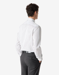 Essential elegance with a graphic accent. This long-sleeved pure cotton twill shirt is enhanced with a thin blue striped pattern on a white background, for a perfect balance between minimalist design and personality. The French collar and rounded cuffs add a formal contemporary touch, while the regular fit ensures comfort and versatility. Ideal under a blazer or worn alone, it is a versatile garment designed to accompany every moment of the day in elegant Italian style. DETAILS AND MATERIALS - 100% cotton - long-sleeved cotton twill shirt - regular fit - French collar - rounded cuffs FIT & WASHING - This garment has a regular fit. The model is wearing a size 41 (IT). Model’s measurements: height 187cm, chest 98cm, waist 82cm, hips 98cm. Maximum wash temperature 40°, do not bleach, dry clean with perchloroethylene, do not tumble dry, maximum iron temperature 150°