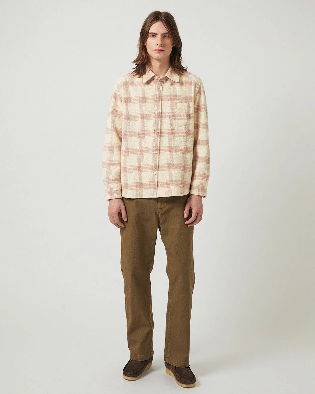 A heavyweight cotton flannel, featuring a custom-designed plaid and a single chest pocket. Substantial on the body yet easy to wear. A warm, textural staple for crisp weather. - 100% Cotton - Heavyweight flannel - Custom designed textile - Single chest pocket - Made with care in India - LS0218 Michael is 6’2” and is wearing a size M.