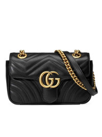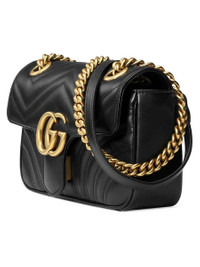 - GG Marmont Mini - Colour: Black - Calfskin Leather - Sliding chain strap - Antique gold-toned hardware - Double G - Matelassé chevron with a heart - Internal open pocket - Flap with spring closure - Style ID: 446744 DTDIT 1000 - Dust bag & Authenticity card - Made in Italy Measurements - Width: 22cm x Height: 13cm x Depth: 6cm - Shoulder strap with 55cm drop or can be worn as a top handle with 30cm drop