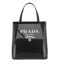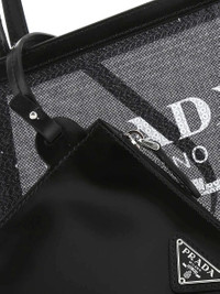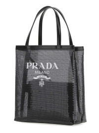 - Logo Print Sequin Tote Bag - Colour: Black - 100% Polyamide - Enameled metal triangle logo on the flap - Flap closure with zipper - Logo-print nylon lining - Style ID: 1BG4172D0AF0002 - Dust bag & Care card - Made in Italy Measurements - Width: 23cm x Height: 22cm - x Depth: 7 - cm - Handle: 29cm