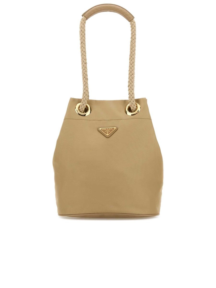 - Colour: Camel Brown - Composition: 100%RECYCLED POLYAMIDE-100%CALF LEATHER - Made in: IT - Style ID: 1BE0822HG8_F0040 - Measurements: Width: 22cm x Height: 28cm x Depth: 12cm - Handle height: 20cm