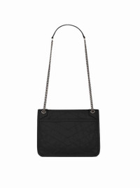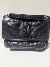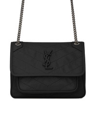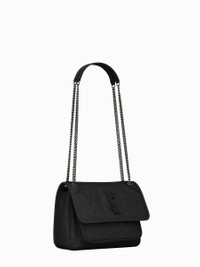 - Niki Baby Bag - Colour: Black - 100% Calfskin leather - Leather-covered YSL initials - Brushed antiqued silver-tone metal hardware - Grosgrain lining - Leather-reinforced chain strap - Can be worn crossbody or doubled for shoulder carry - Magnetic snap closure - Exterior: one flat pocket on the back - Interior: one main compartment, one flat pocket and one pocket under the flap - Style ID: 5330370EN041000 - Dust bag & Care card - Made in Italy Measurements - Width: 21cm x Height: 16cm x Depth: 7.5cm - Unfolded shoulder strap drop: 57cm - Folded shoulder strap drop: 30cm