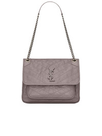 - Niki bag - Colour: Fog - 100% Calfskin Leather - Chrome free, metal free tanned leather and organic cotton lining - Grosgrain lining - Brushed silver-toned metal hardware - Magnetic snap closure - Exterior: one magnetic pocket at the back - Interior: one main compartment, one open pocket, one zip pocket, one pocket under the flap - Dust bag & Authenticity bag - Style ID: 498894 0EN04 1202 - Made in Italy Measurements - Width: 28cm x Height: 20cm x Depth: 8.5cm - Single strap drop: 50cm - Doubled strap drop 28cm