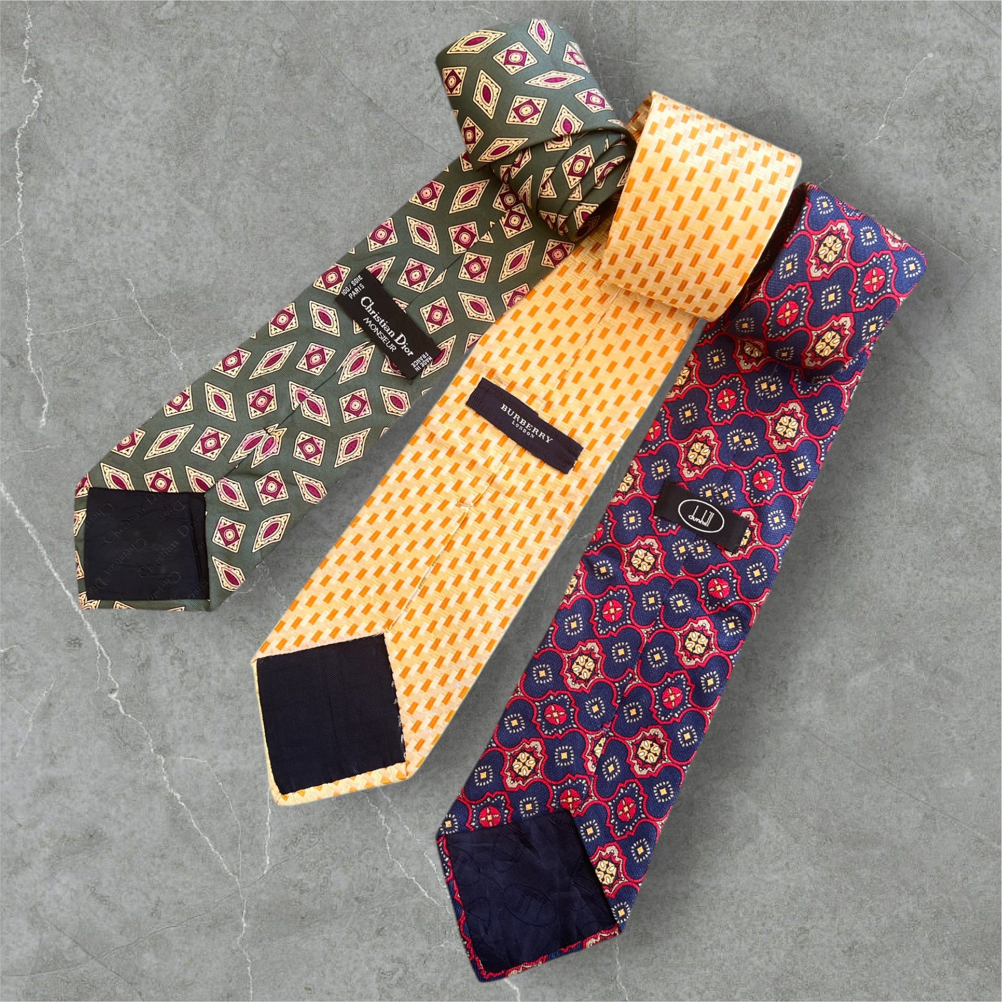 Styling your formal look with these combo luxurious vintage neckties. 1. Brand : BURBERRY LONDON Material : 100% Silk MADE IN ITALY 2. Brand : DUNHILL Material : 100% Pure Silk MADE IN ITALY 3. Brand : CHRISTIAN DIOR Material : 100% Silk MADE IN FRANCE VINTAGE COLLECTION CONDITION - 9/10 GOOD No defect spotted. Please enlarge the photos for preview. Necktie ONLY, don't come with original box, original receipt or original paper bag ATTENTION!!! AN ITEM THAT BEEN USED OR WORN PREVIOUSLY. PLEASE GO THROUGH OUR LISTING FOR FULL DETAILS AND DESCRIPTION OF ANY IMPERFECTIONS. PLEASE DON’T EXPECT IT TO BE LIKE NEW OR IN PRISTINE CONDITION. “WE TRY OUR BEST TO EXPLAIN THE DETAIL CONDITION OF ITEM”