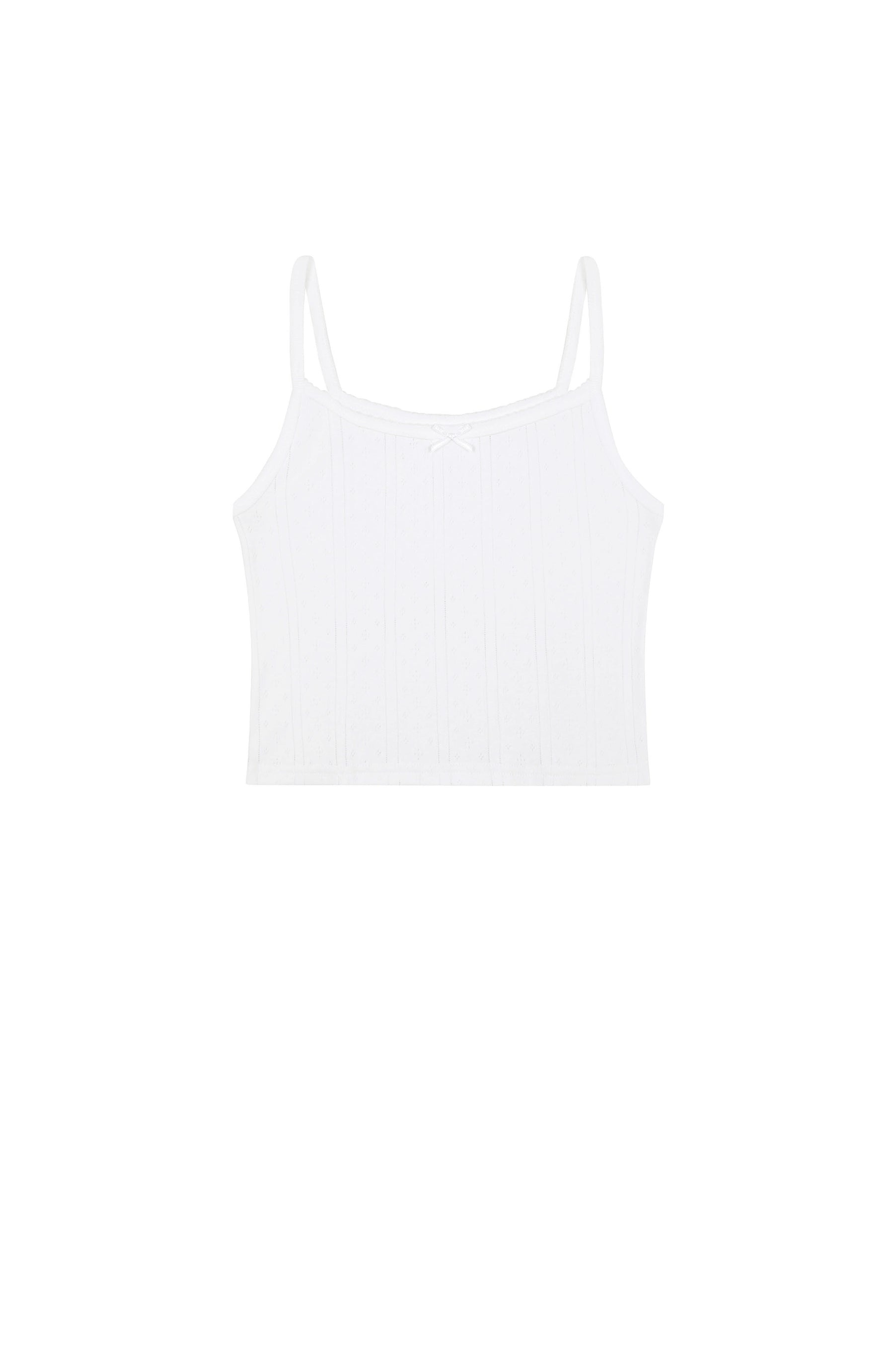 Inspired by the ones you used to wear. Featuring the perfect scoop-neck silhouette and delicate picot-trim detailing. The Picot Tank is your new everyday go-to crop that could’ve been found that summer thrifting on the Amalfi coast. FABRIC & CARE Consciously made with our signature, bespoke 100% Organic Cotton Pointelle. Fabric: 100% Organic Cotton Pointelle To take care and keep your Cou Cou's looking cuter, for longer, just wash your pieces on gentle, lay flat to dry & voila! These more gentle care methods aren’t just better for your Cou Cou's, they’re better for the planet, too. Designed in London. Made in Portugal. SIZE & FIT Features a cropped body, subtle scooped neckline, delicate picot trim detailing and centre-front baby bow. The Picot Tank is considered standard in sizing. In order of appearance: Paola wears an S. Amata and Rene wear an XS. Sylvie wears an L in The Picot Tank.