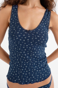 Inspired by your favourite childhood vest, reimagined with the effortless romance of 90’s Gwyneth Paltrow. Trimmed with our signature French Lace & finished with a petit centre-front bow a la Cou Cou. FABRIC & CARE Consciously made with our signature, bespoke 100% Organic Cotton Pointelle. In our newest print, Midnight Fields. Sourced from the English 1900’s archive & reimagined a la Cou Cou. Fabric: 100% Organic Cotton Pointelle French Lace: 90% Polyamide and 10% Elastane To take care and keep your Cou Cou's looking cuter, for longer, just wash your pieces on gentle, lay flat to dry & voila! These more gentle care methods aren’t just better for your Cou Cous, they’re better for the planet, too. Designed in London, made in Portugal. SIZE & FIT Your favourite childhood vest, reimagined. Featuring a scoop neckline & slightly cropped body, sitting just below the belly button. Trimmed with our signature French Lace & finished with a baby, centre-front bow. The Scoop Tank fits true to size. If you’re in-between sizes, we recommend sizing down. In order of appearance: Lilou wears an XS. Jade wears an S in The Scoop Tank.
