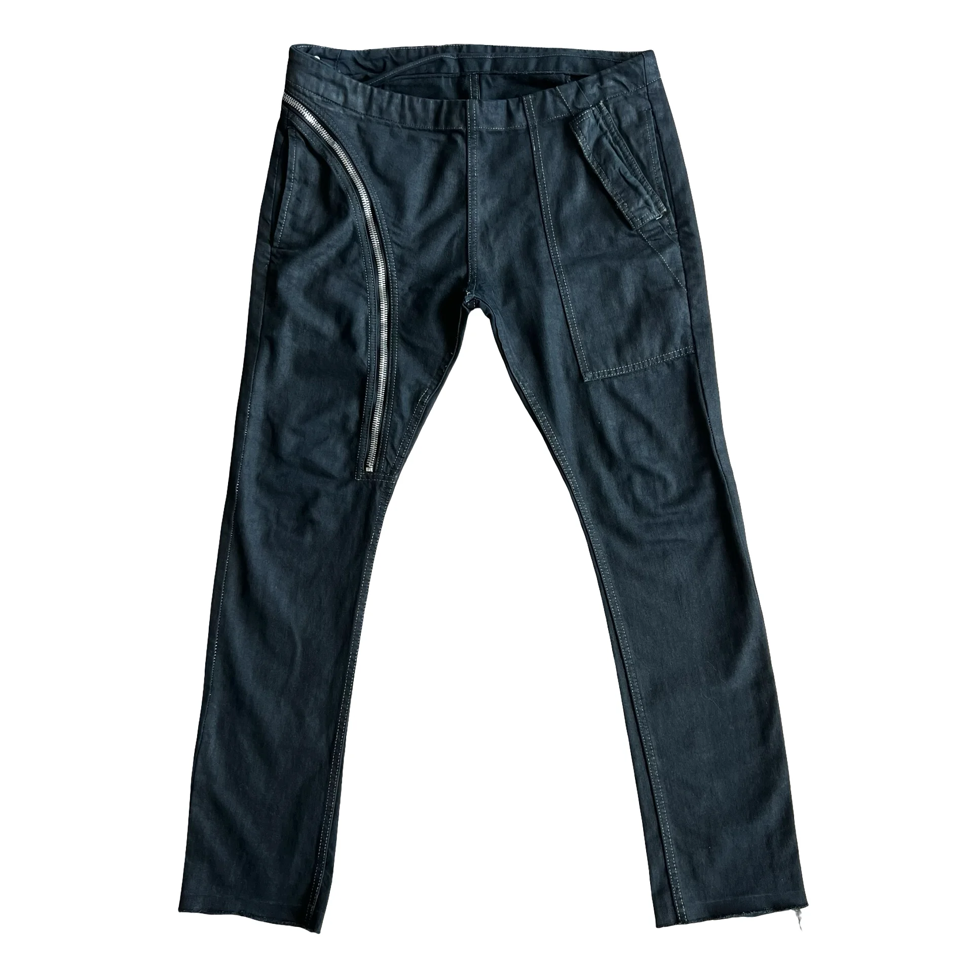 Sample pair Hem has been released so has a raw hem with finished seam to keep it from unraveling material is black matte Waist uncinched: 17.5 waist cinched once: 16in waist cinched twice: 30In Rise: 10in Thigh: 8.5in Inseam: 31in Leg Opening: 7In