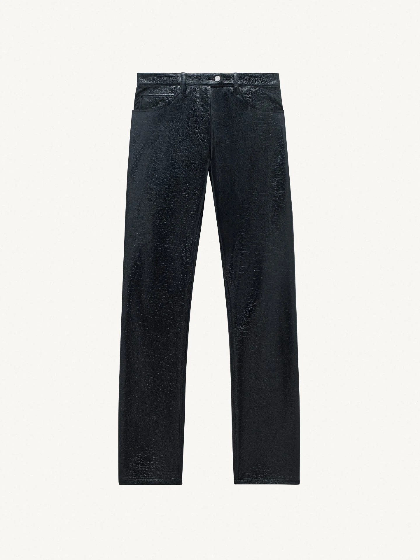 Vinyl pants with tone-on-tone logo on the back pocket. Closure fly style Courreges with zip and lacquered pressure. Two Italian pockets on the side, two patch pockets on the back. Model not lined. DETAILS Composition: 88% cotton, 10% polyurethane, 2% elastane Country of Manufacture: RS SKU: PERCPA013VY00039999 Color: Black
