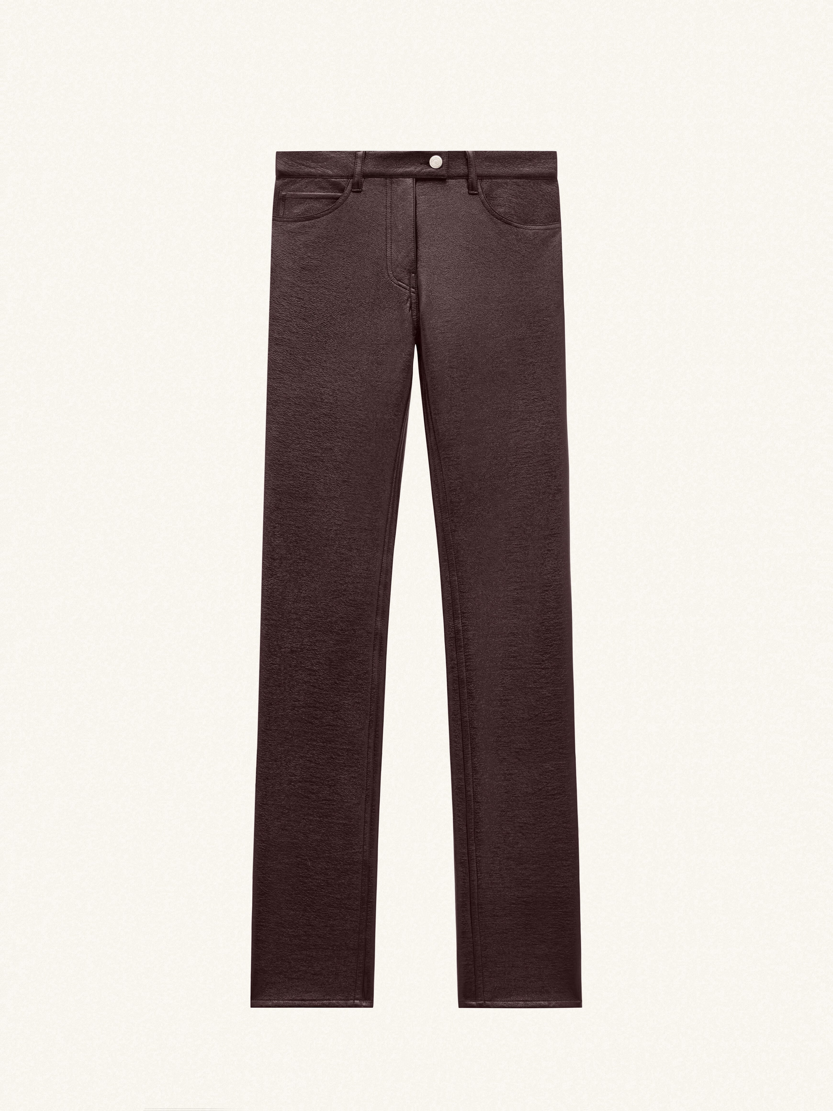 Vinyl pants with tone-on-tone logo on the back pocket. Closure fly style Courrèges with zip and lacquered pressure. Two Italian pockets on the side, two patch pockets on the back. Model not lined. DETAILS Composition : 88% COTON 10% POLYURETHANE 2% ELASTHANE 100% COTON Color : Burgundy Item code : PERCPA013VY00144010
