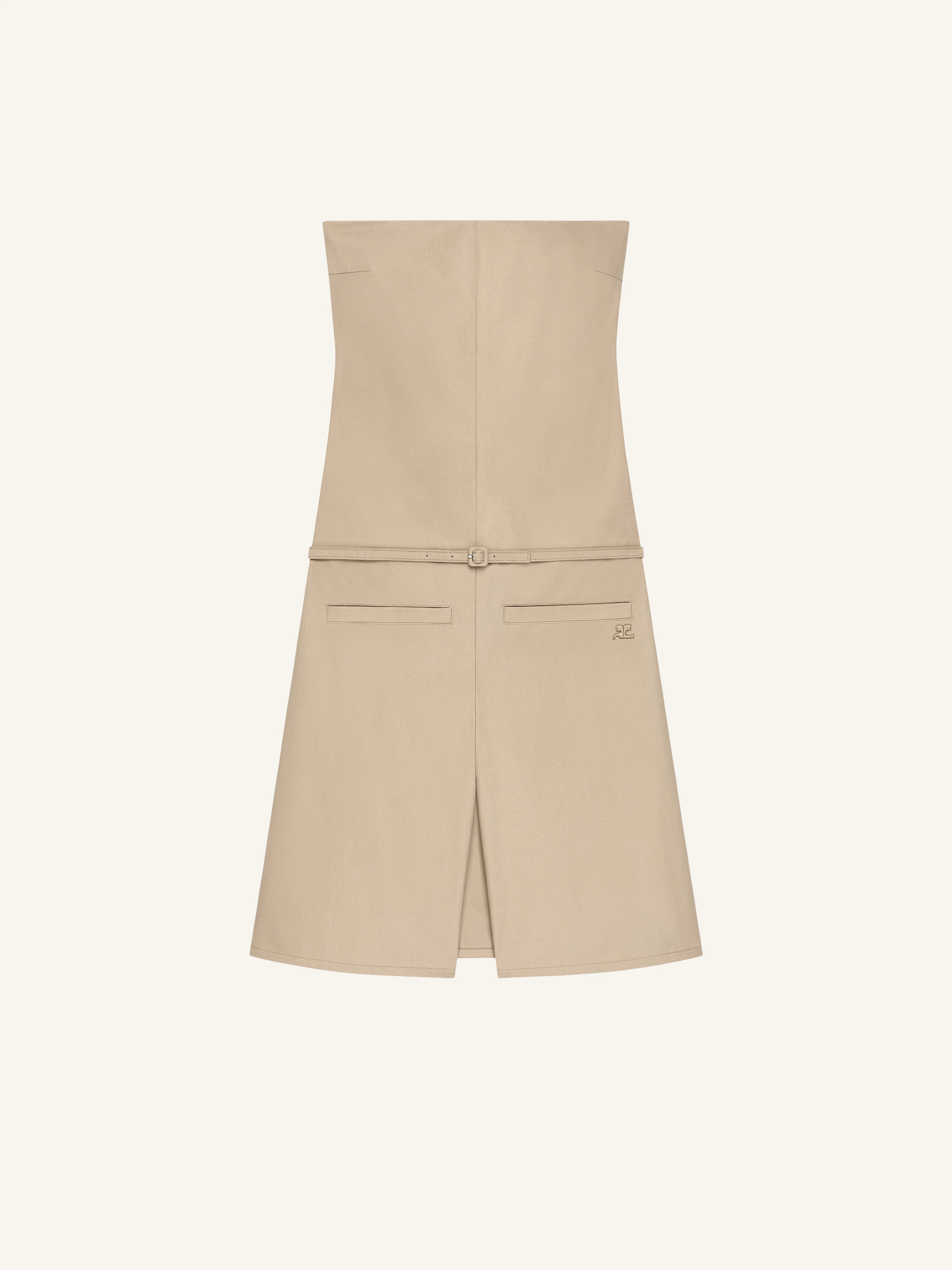 Canvas cotton bustier overall with skirt effect back panel. Two welt pockets and embroidered AC logo on the front. Adjustable belt and ‘Courreges’ logo on jacron label at the back. The model is 1.79m and wears a size 36. DETAILS Composition: 100% cotton Country of Manufacture: RO SKU: 226CCB057CO01341005 Color: Beige