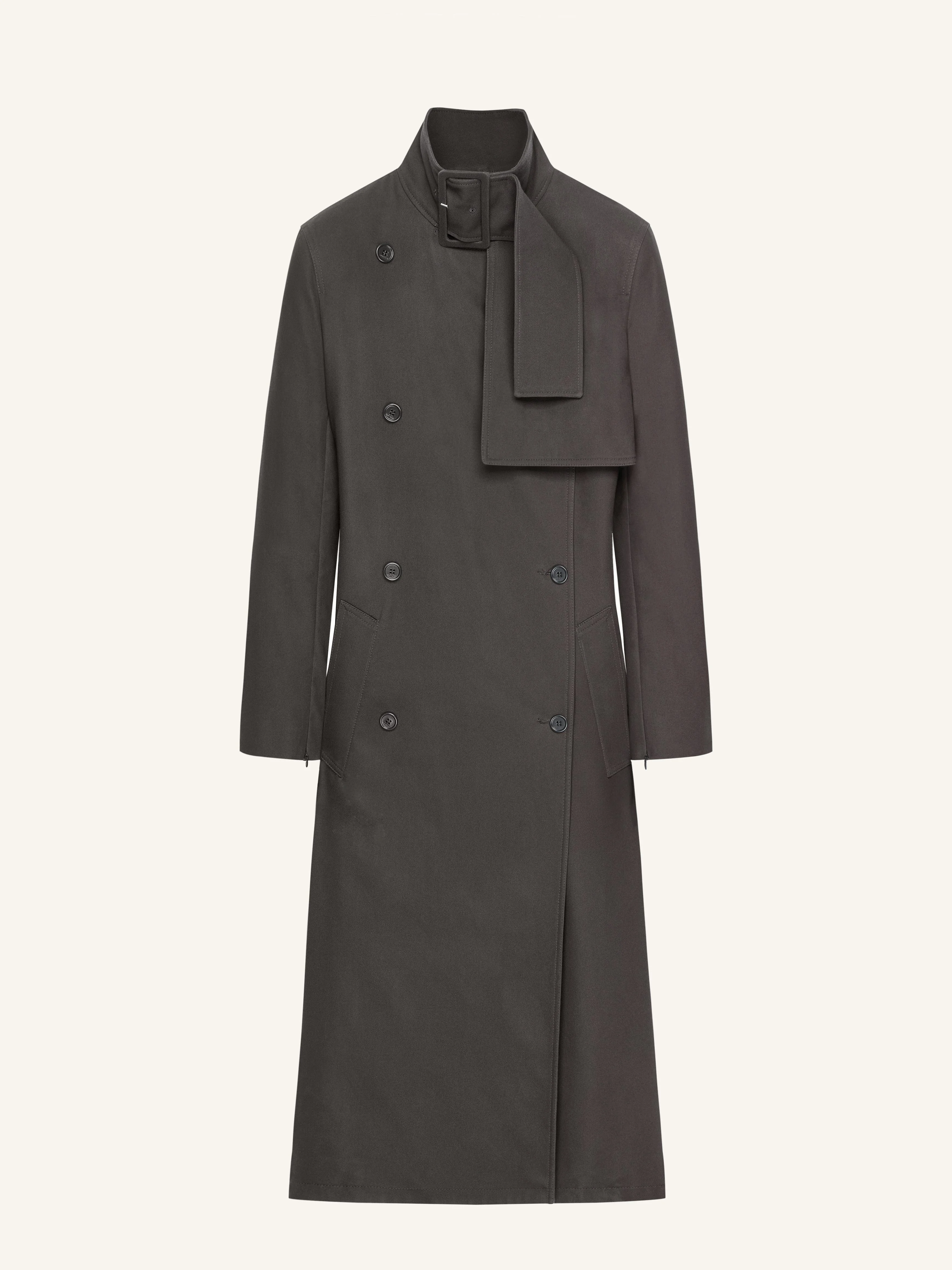 Long double breasted cotton trench coat with adjustable buckle at the collar. Back belt and two side pockets. The model is 1.77m and wears a size 36. DETAILS Composition: 100% cotton Country of Manufacture: SK SKU: 126CMA263CO01349917 Color: Carbon