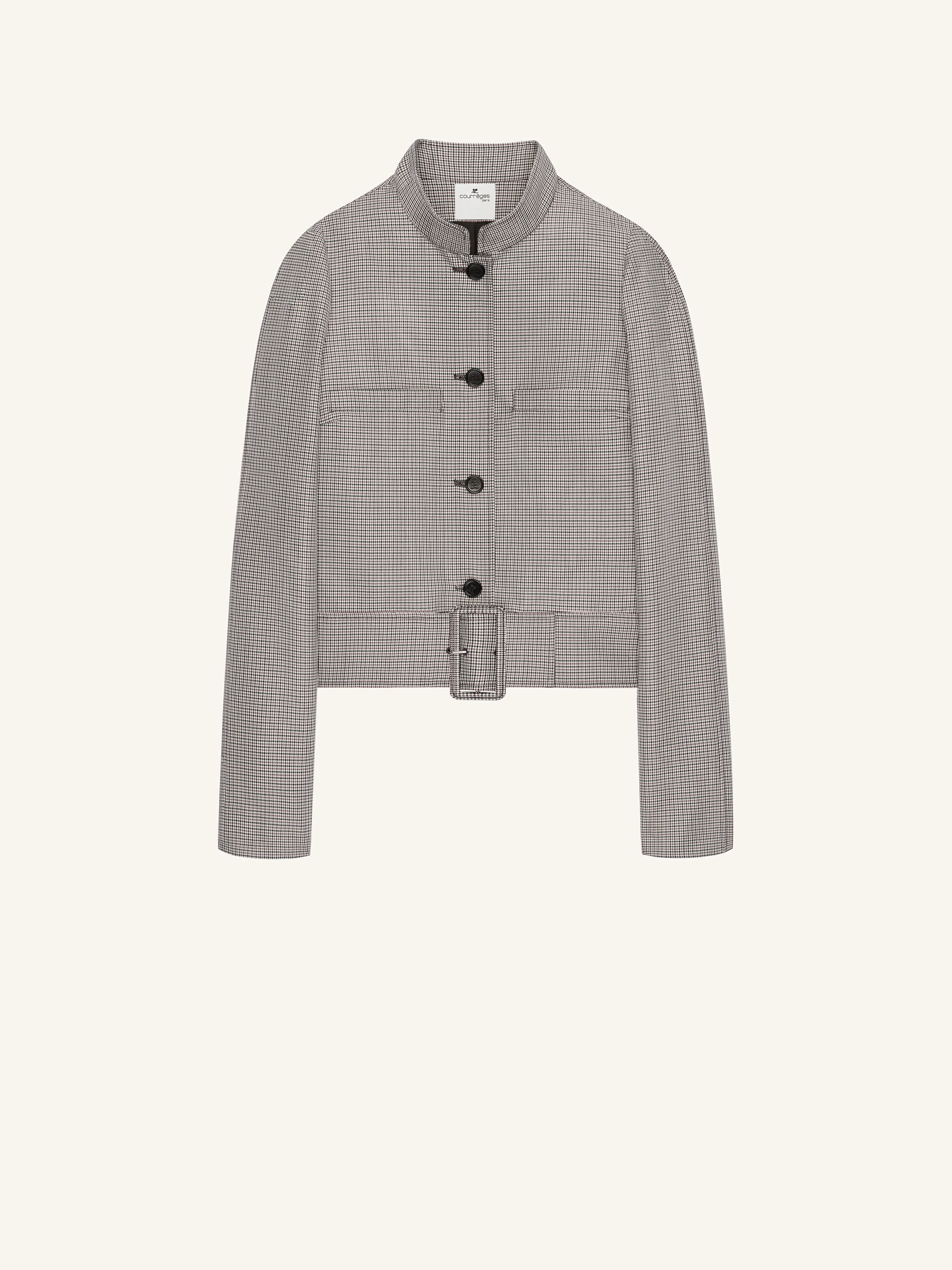 Heritage houndstooth wool jacket with high collar and adjustable buckle at the waist. Two front welt pockets and button closure. The model is 1.77m and wears a size 36. DETAILS Composition: 52% silk , 48% polyester Country of Manufacture: SK SKU: 126CVE146WO01459925 Color: Natural / Red / Black