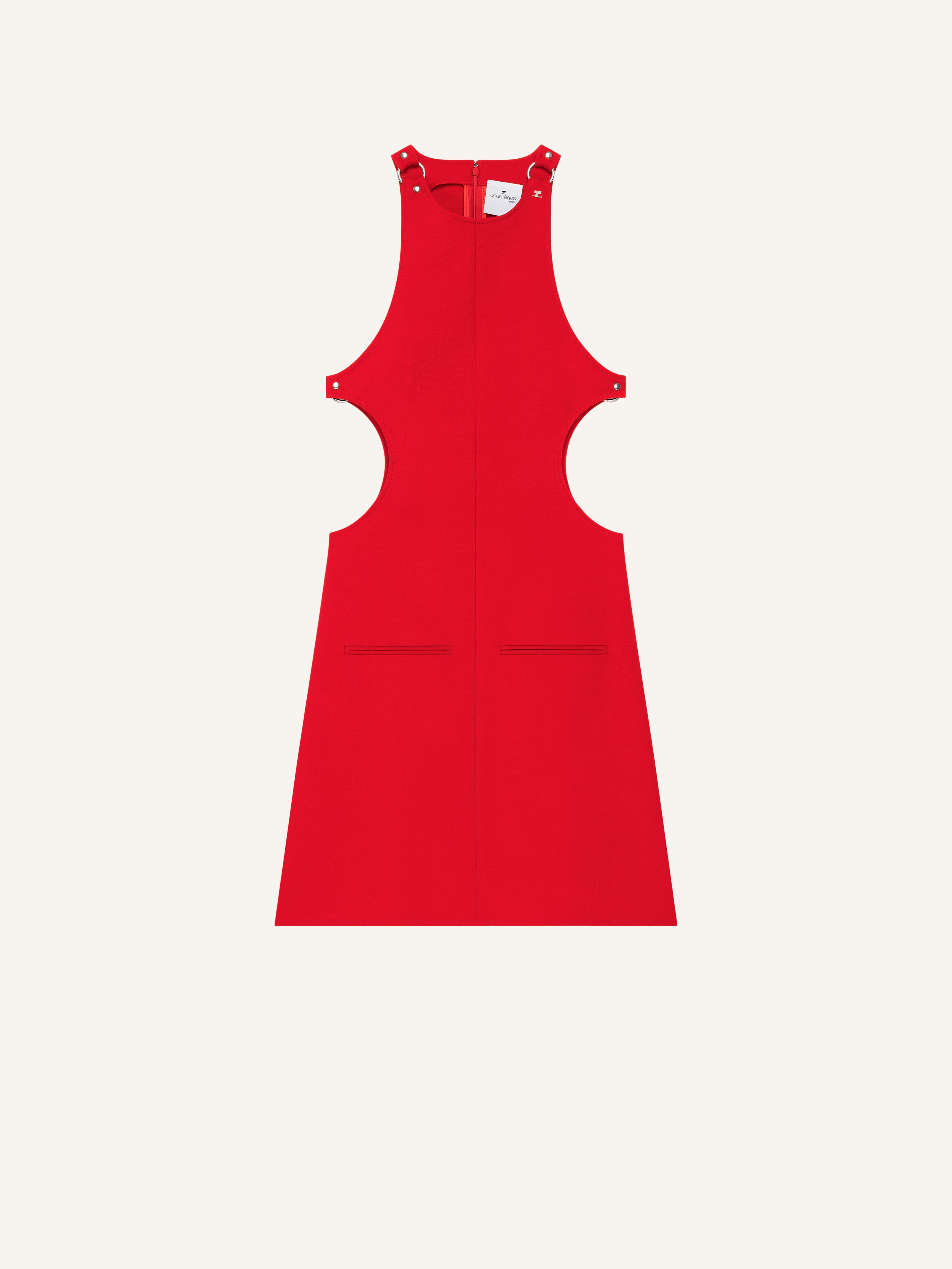 Sleeveless A-line wool dress with buckle details on straps and sides. Two front welt pockets and cut-outs on sides. The model is 1.77m tall and wears a size 36. DETAILS Composition: 93% wool, 4% elastane, 3% polyamide Country of Manufacture: RO SKU: 325CRO687WO01134040 Color: Poppy