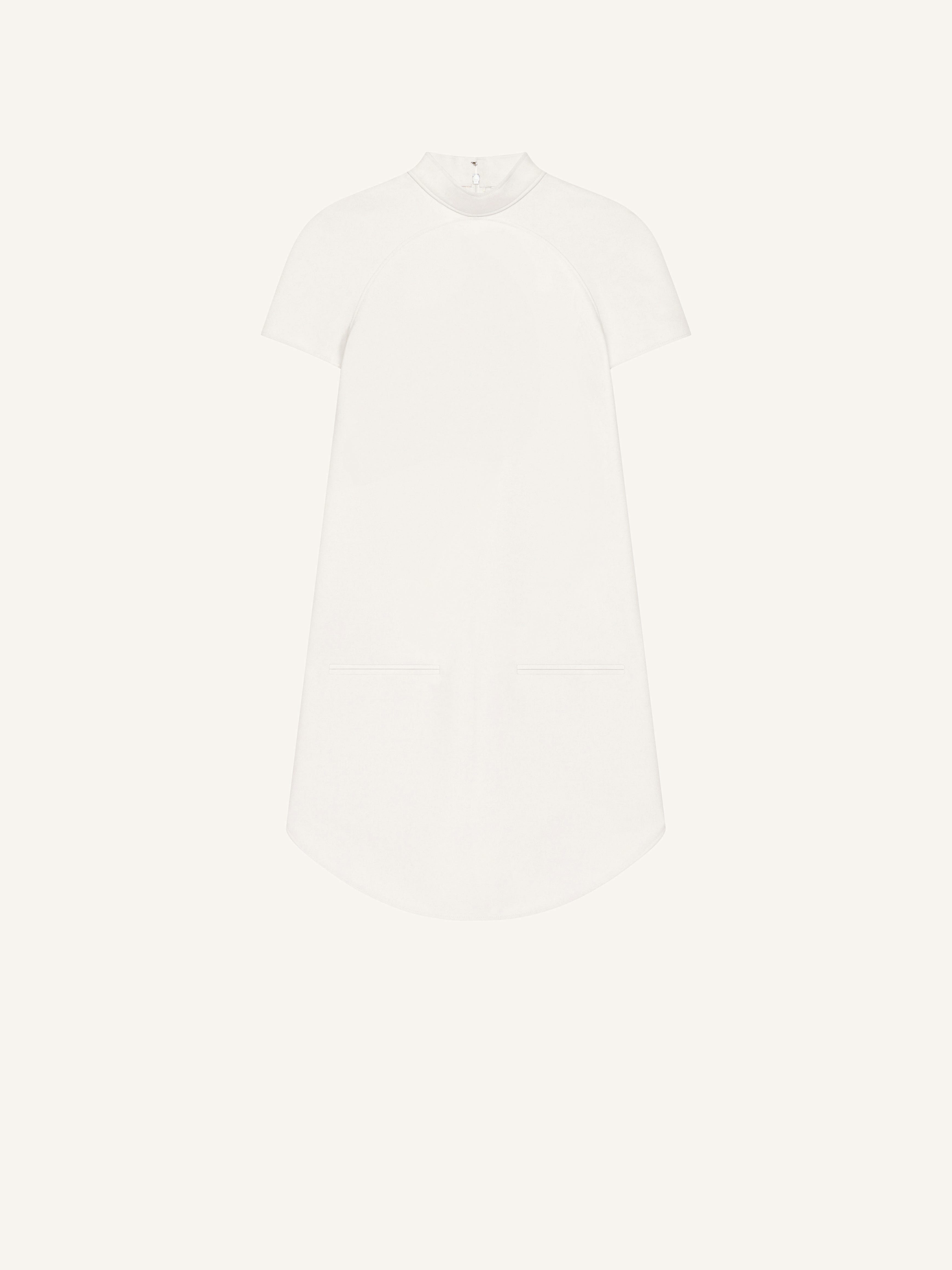 Short-sleeved mockneck wool dress with zipped fastening at back and two front welt pockets. The model is 1.77m tall and wears a size 36. DETAILS Composition: 45% polyester, 36% wool, 16% polyamide, 3% lyocell Country of Manufacture: RS SKU: 325CRO681WO01430001 Color: Heritage White