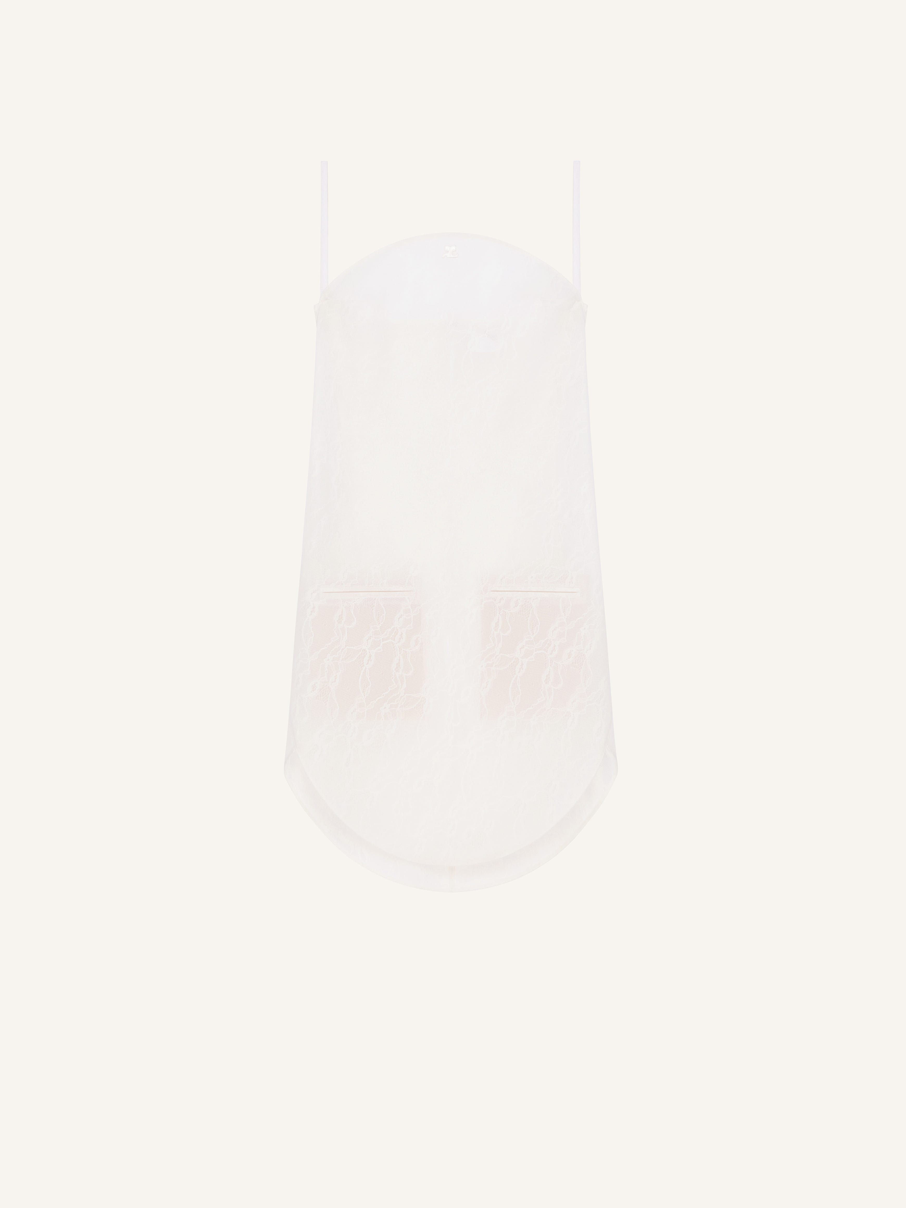 Short lace dress with thin straps and two front welt pockets. AC logo below circular neckline. The model is 1.77m tall and wears a size 36. DETAILS Composition: 54% polyamide, 32% polyester, 14% other Country of Manufacture: IT SKU: 325CRO684PA01350001 Color: Heritage White