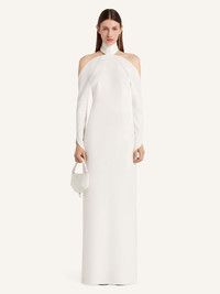 Mockneck gown with oblique sleeves. Bare back and shoulders. The model is 1.77m tall and wears a size 36. DETAILS Composition: 89% polyester, 11% polyurethane Country of Manufacture: IT SKU: 325CRO683PL01590001 Color: Heritage White