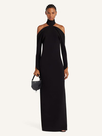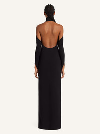 Mockneck gown with oblique sleeves. Bare back and shoulders. The model is 1.77m tall and wears a size 36. DETAILS Composition: 89% polyester, 11% polyurethane Country of Manufacture: IT SKU: 325CRO683PL01599999 Color: Black