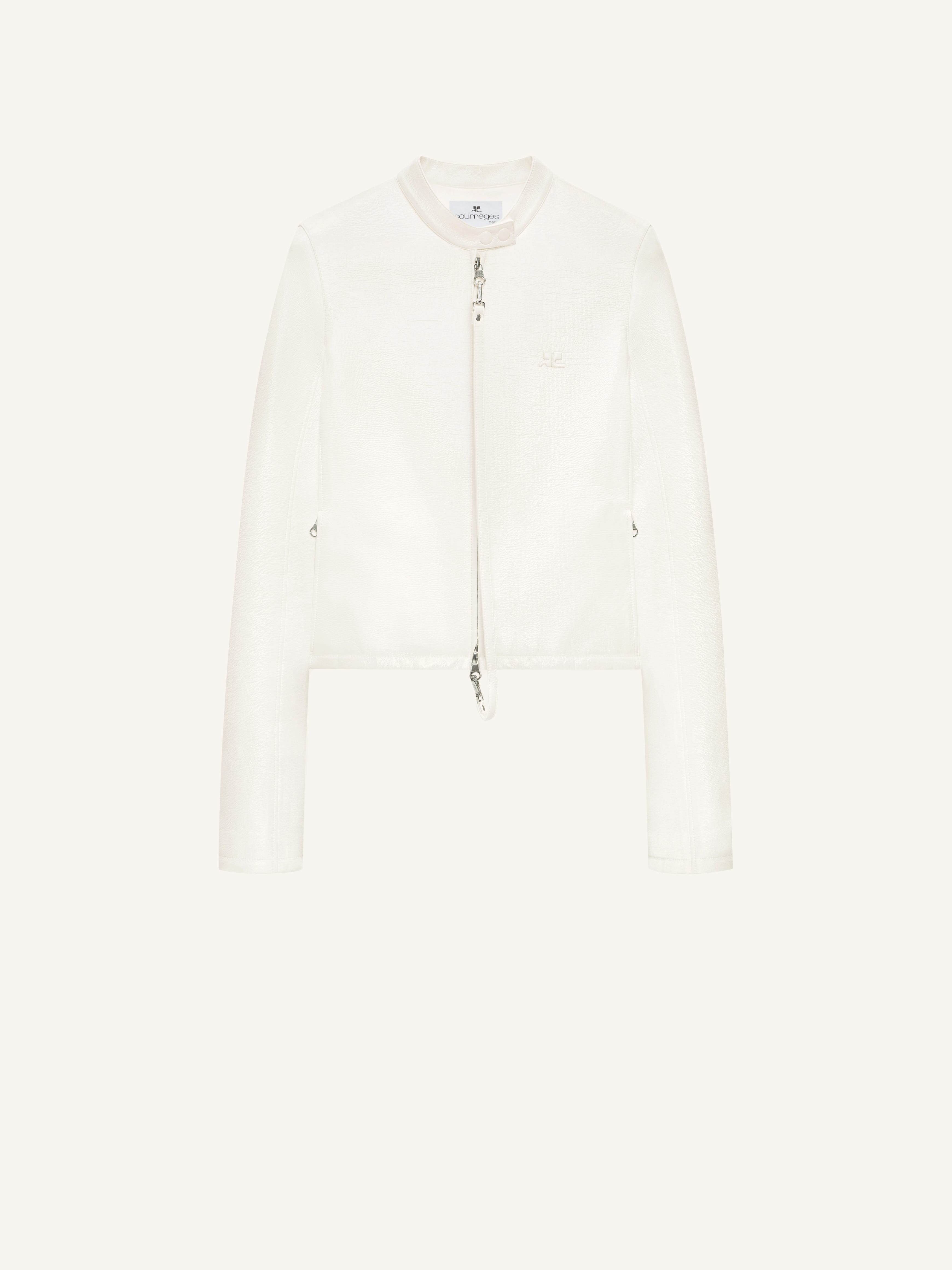 City style vinyl jacket with embroidered AC logo on the front. Vinyl detachable wire with "Courreges" snap hook and adjustable snaps at collar. The model is 1.74m tall and wears a size 36. DETAILS Composition: 88% cotton, 10% polyurethane, 2% elastane Country of Manufacture: SK SKU: 325CBL293VY00140001 Color: Heritage White