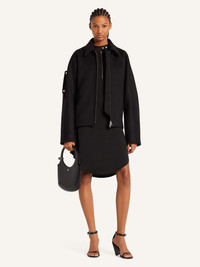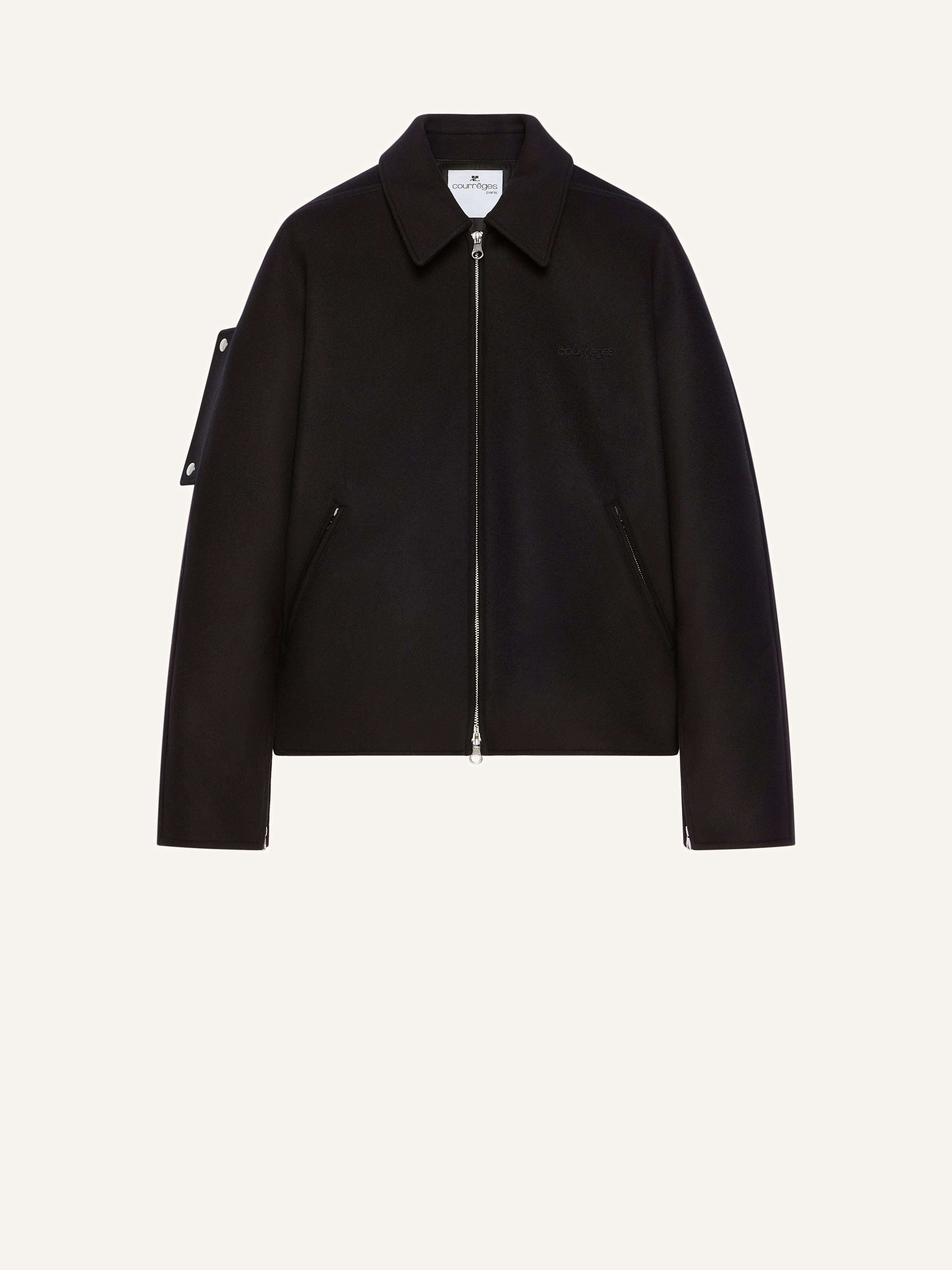 Zipped wool bomber jacket, rib-knit in the back, and side pockets. Embroidered "Courreges" logo at chest and zipped sleeves. This item is unisex. The female model is 1.77m tall and the male model is 1.88m tall, both wearing size M. DETAILS Composition: 97% wool, 3% silk Country of Manufacture: LT SKU: 325CBL308WO01189999 Color: Black