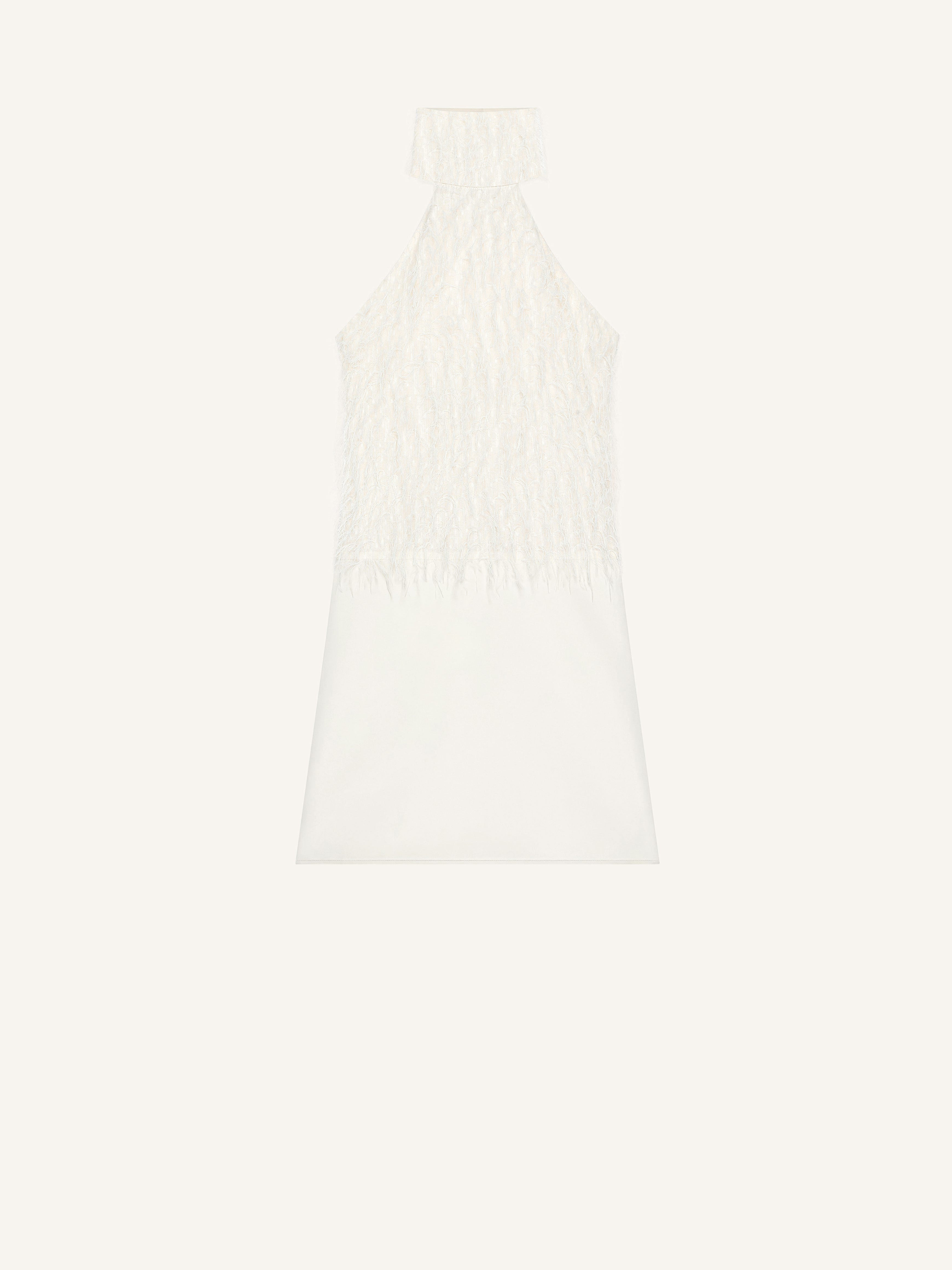 Mixed material halter neck dress in "fils coupes" textured fabric and crepe skirt. Bare back. The model is 1.79m tall and wears a size 36. DETAILS Composition: 56% acetate, 44% viscose Country of Manufacture: IT SKU: 425CRO714AC00310079 Color: Natural Beige