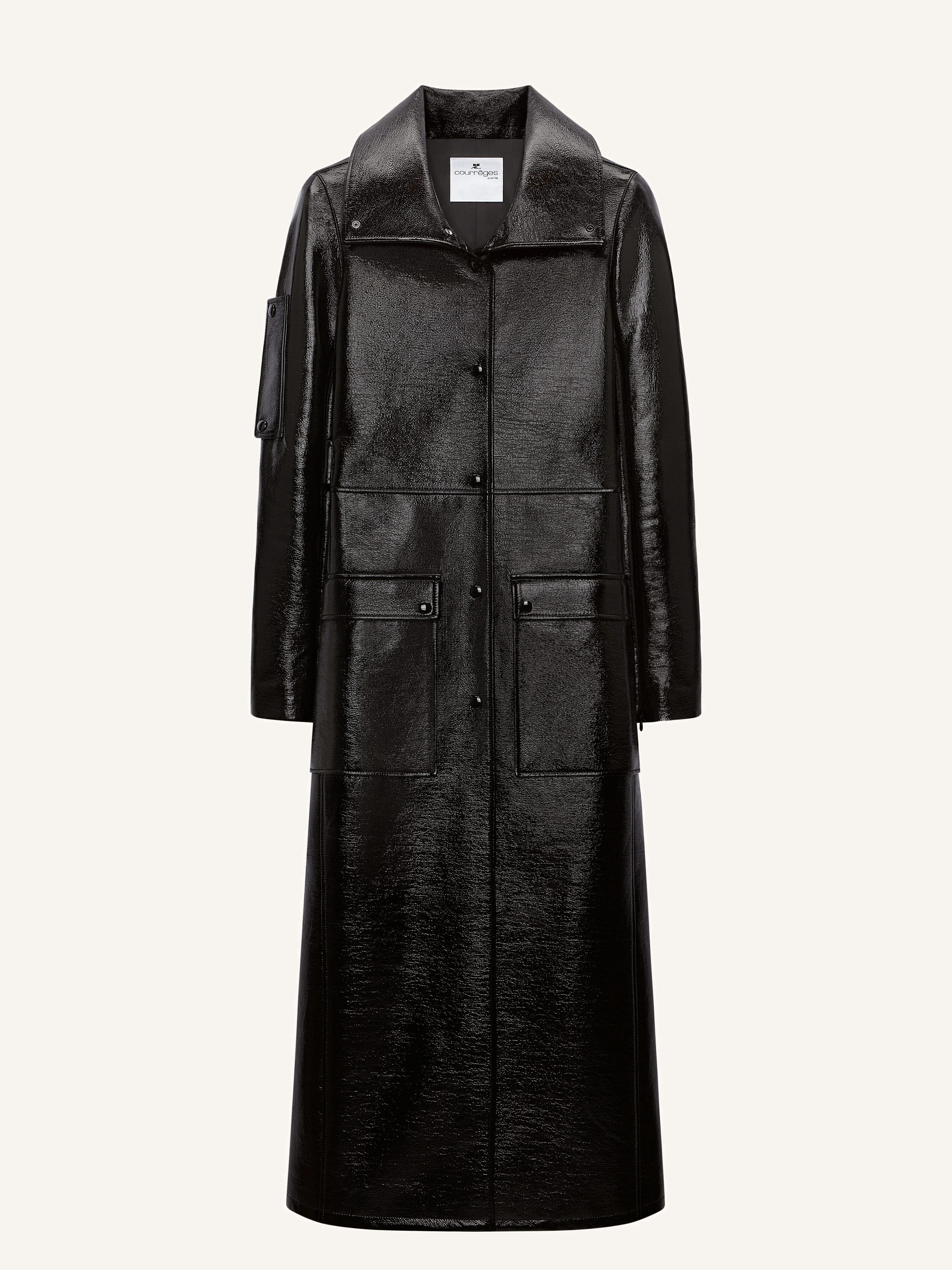 Long fitted vinyl trench coat with large collar, zipped sleeves and two front pockets. Front button closure and buttoned back belt. The model is 1.77m tall and wears a size 36. DETAILS Composition: 88% cotton, 10% polyurethane, 2% elastane Country of Manufacture: SK SKU: 325CMA234VY00149999 Color: Black