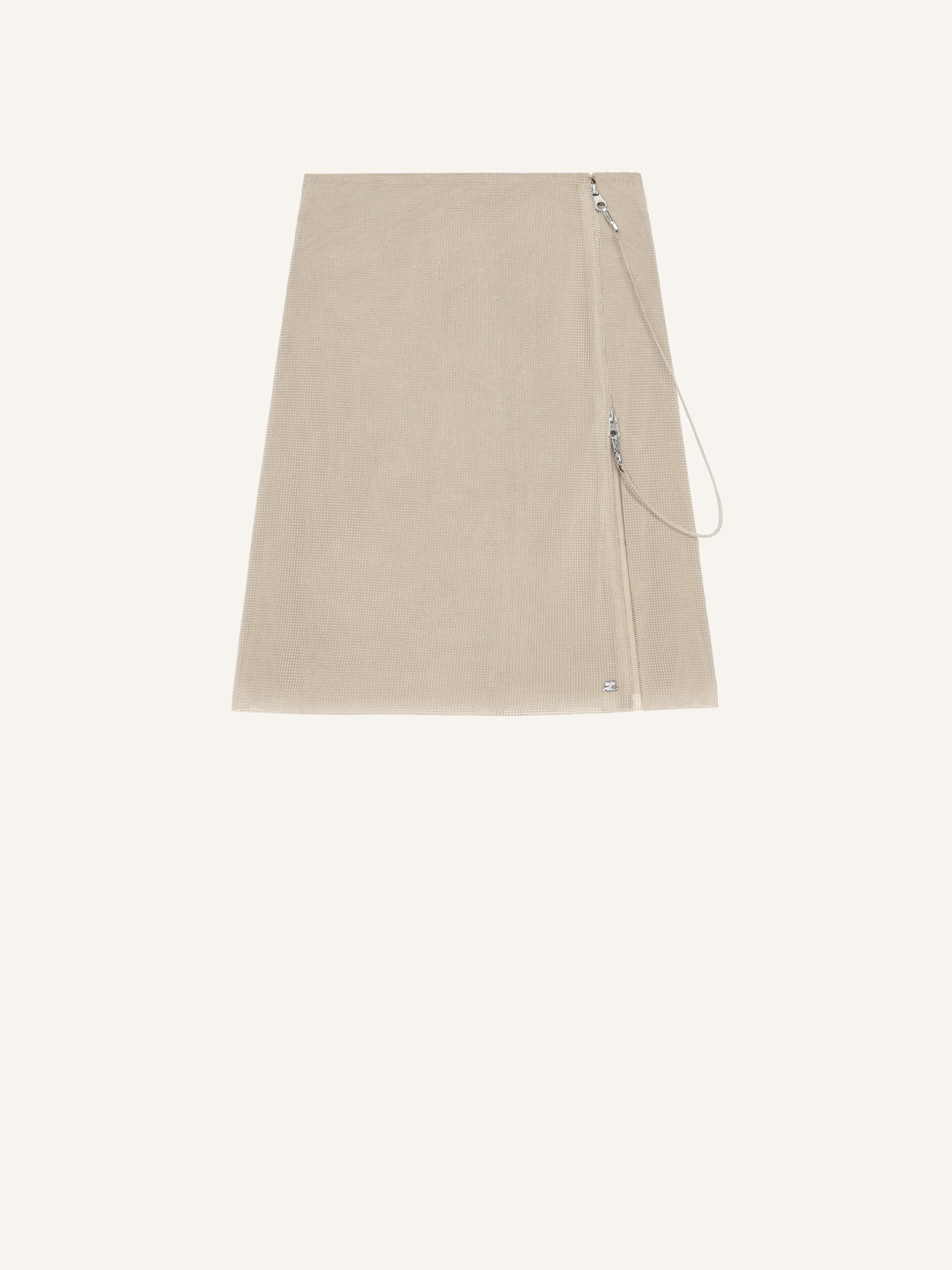 Mid-length transparent skirt with hotfix and zipped opening on the side. Detachable wire and metallic AC logo at the bottom. The model is 1.77m tall and wears a size 36. DETAILS Composition: 47% polyamide, 45% aluminium, 8% elastane Country of Manufacture: IT SKU: 325CJU294EM00039008 Color: Nickel