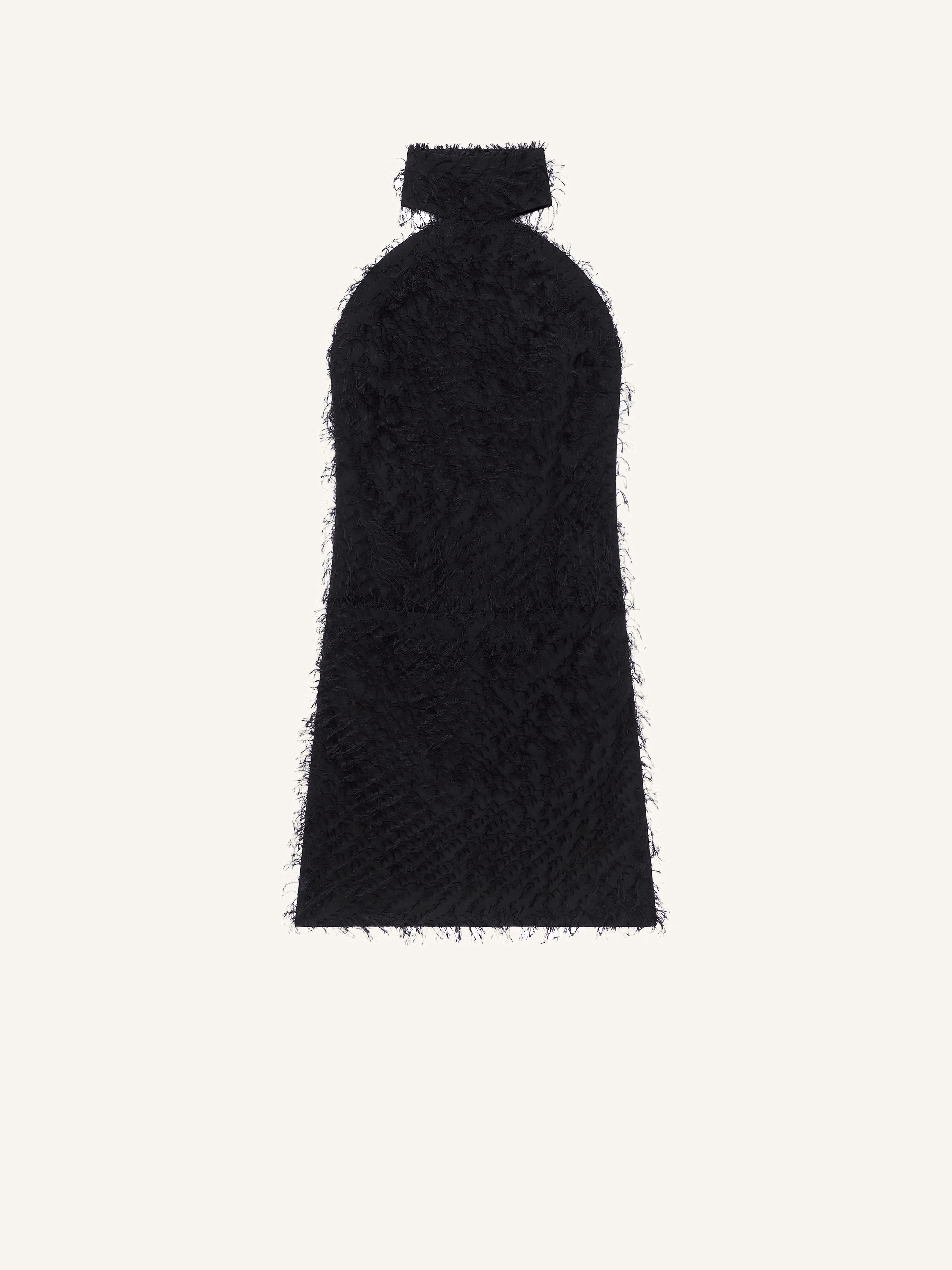Sleeveless mockneck dress in "fils coupes" textured fabric. Bare back and shoulders. The model is 1.77m tall and wears a size 36. DETAILS Composition: 72% acetate, 28% viscose Country of Manufacture: IT SKU: 325CRO688AC00309999 Color: Black